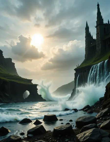 T10,风景、山脉、海浪、岩石、树木、植被、苔藓、汹涌海面、瀑布、(城堡)废墟、日落、蓝色、橙色、黄色、棕色