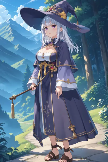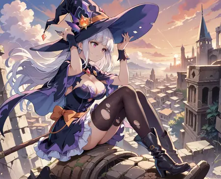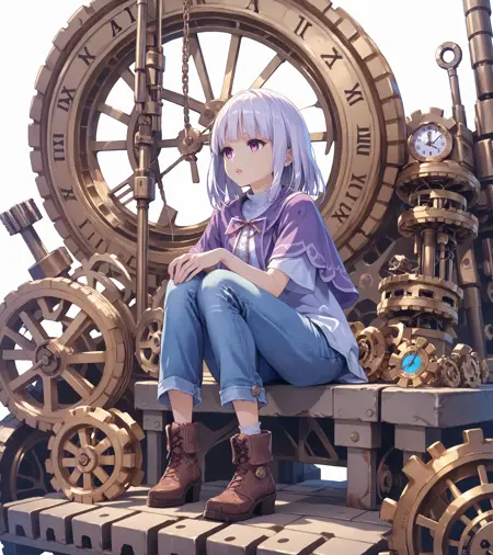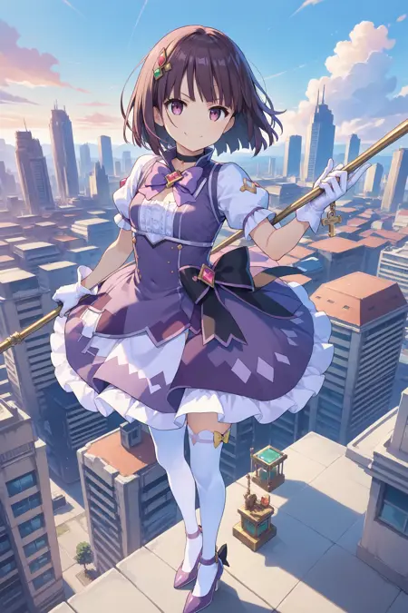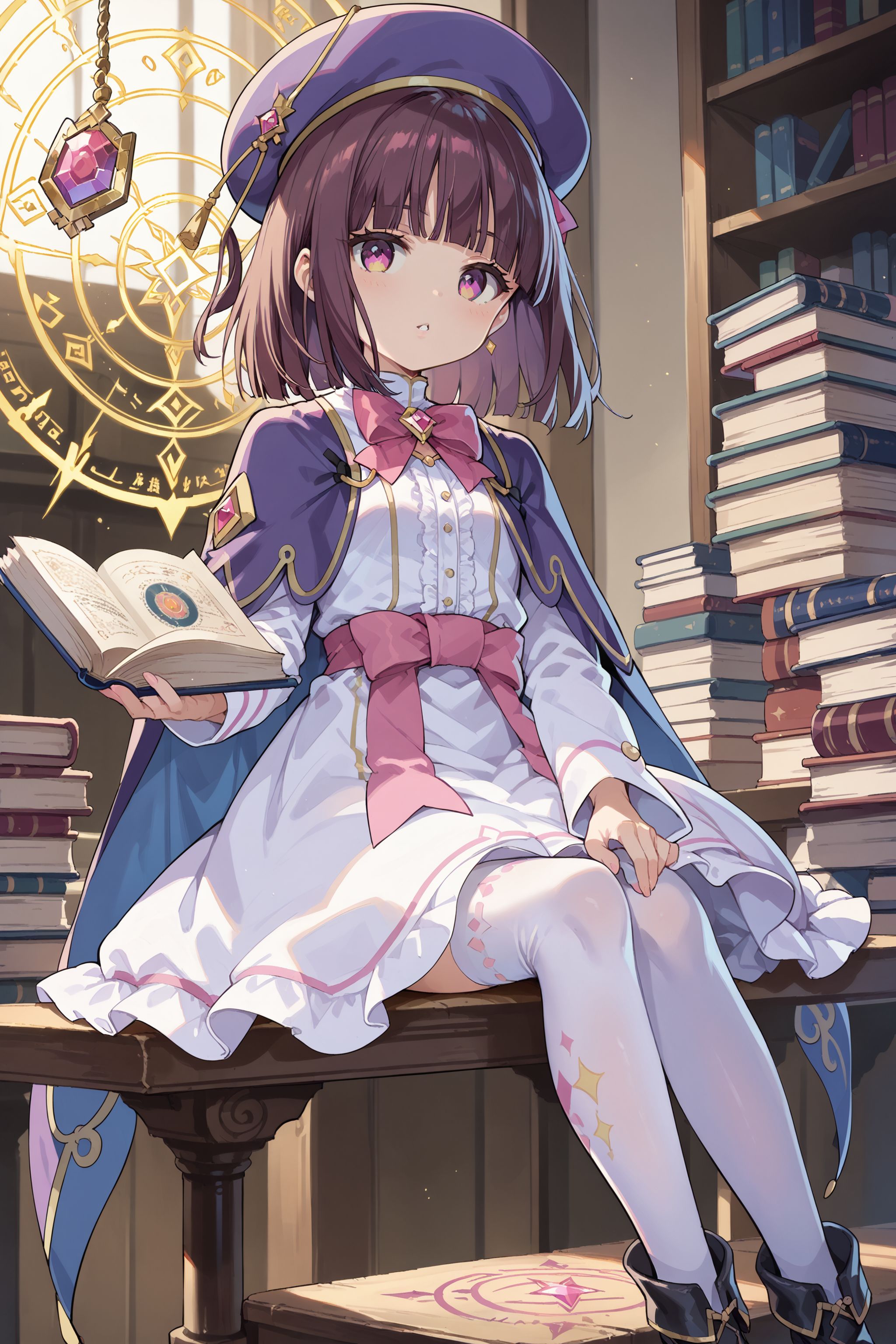 Magica2020: magica2020,紫色头饰,宝石,贝雷帽,肩章,紫色披风,领结,粉红蝴蝶结,白裙,长袖,白长筒袜,高跟靴,
