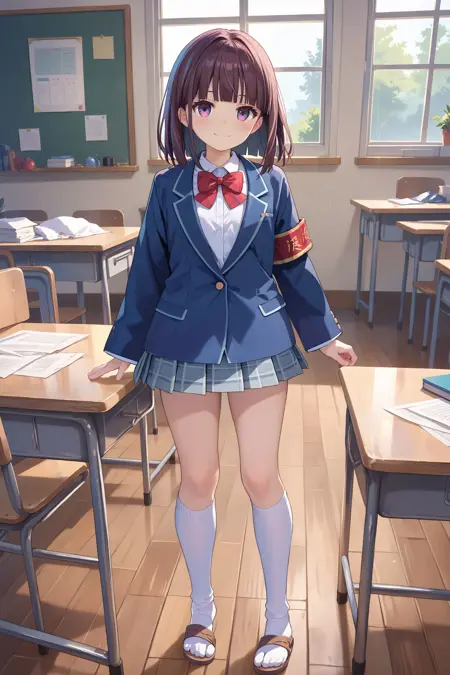 校服: 校服,西装外套,臂章,长袖,袖子过手,红色领结,白衬衫,百褶裙,格子裙,灰裙,白袜,凉鞋
