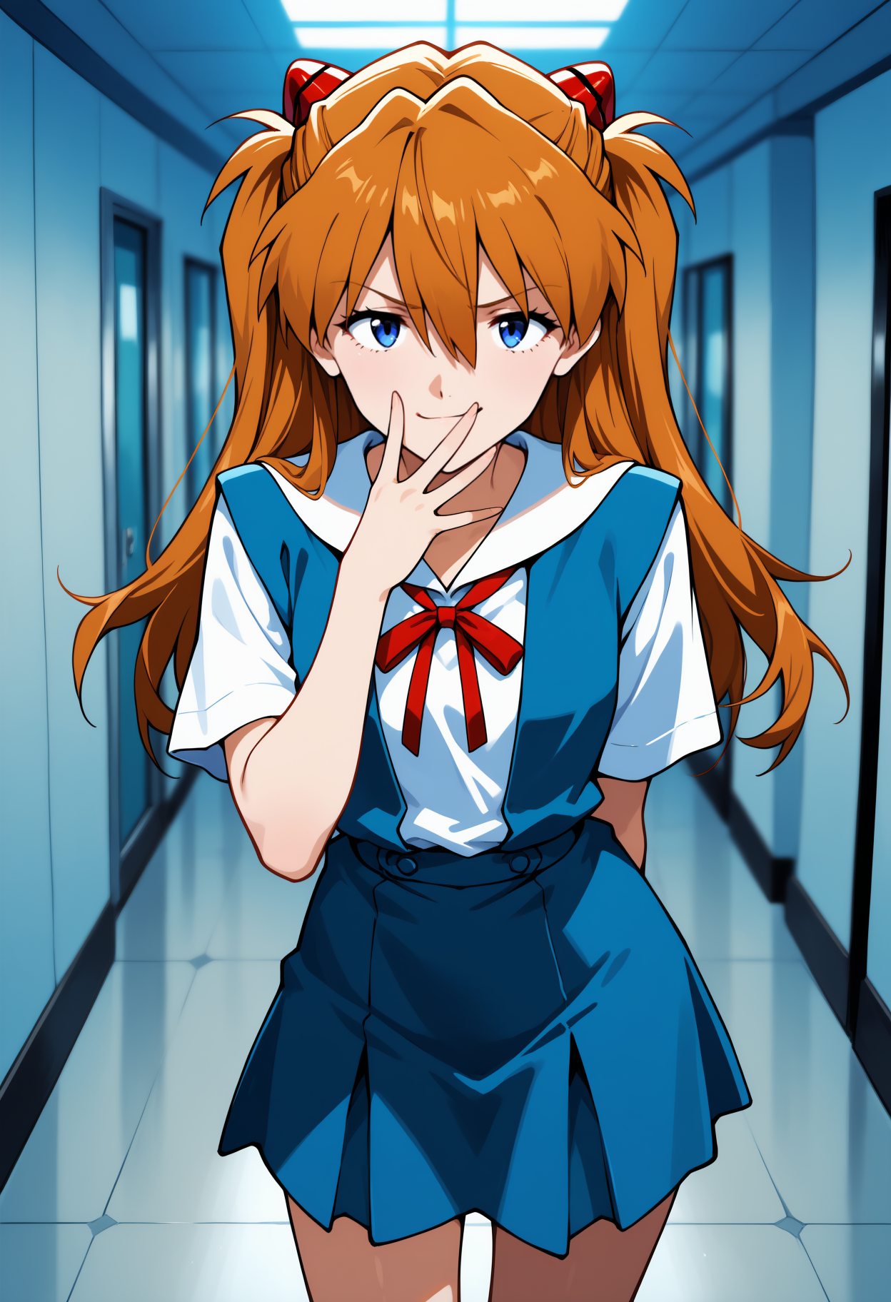 Tokyo-3 Middle School Uniform: long hair, orange hair, hair between eyes, two side up, interface headset, blue eyes, school uniform, white shirt, short sleeves, neck ribbon, red ribbon, blue skirt, suspender skirt, kneehighs, white socks, mary janes
