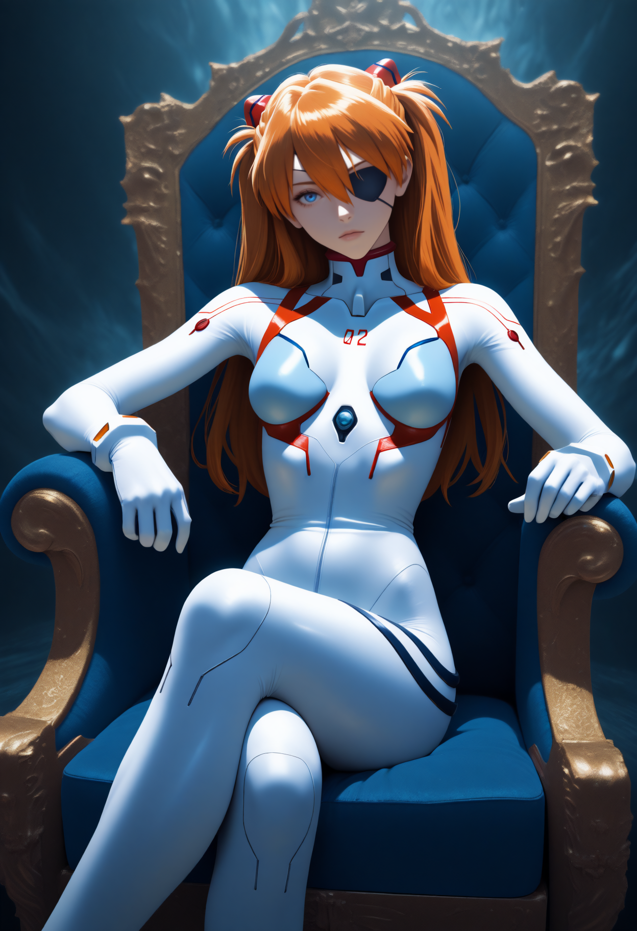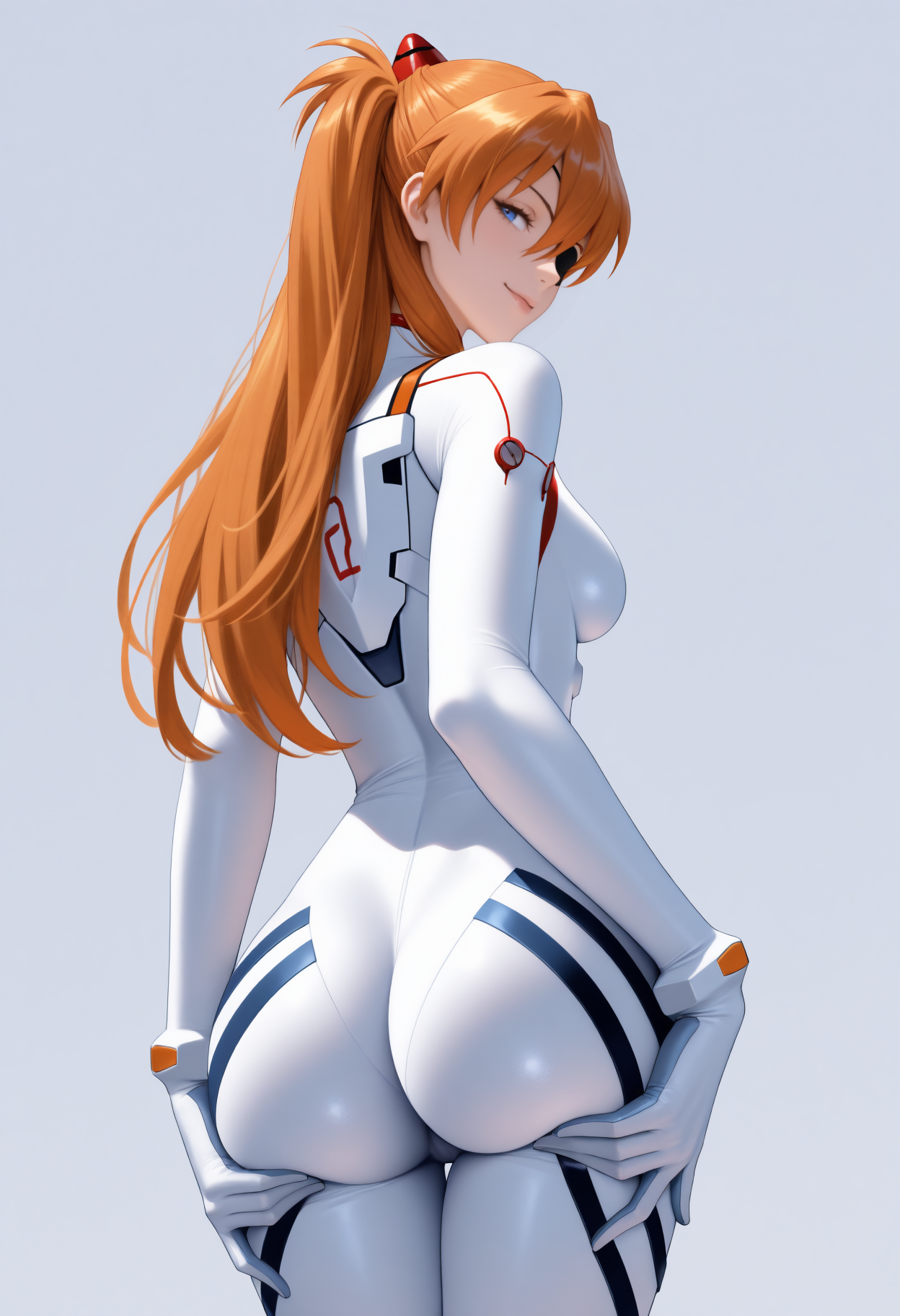 3.0 + 1.0 Plugsuit: long hair, orange hair, hair between eyes, two side up, interface headset, blue eyes, eyepatch, plugsuit, pilot suit, white bodysuit, skin tight, white gloves