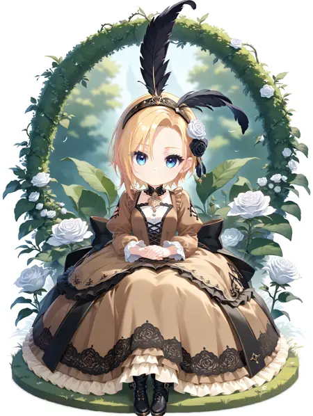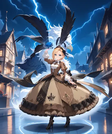 MagicaMaiden: magicamaiden, black feathers, head feather, black hairband, hair flower, black rose, brown dress, puffy sleeves, long Sleeves, long skirt, layered skirt, brown skirt, black skirt, frills, black footwear, high heel boots