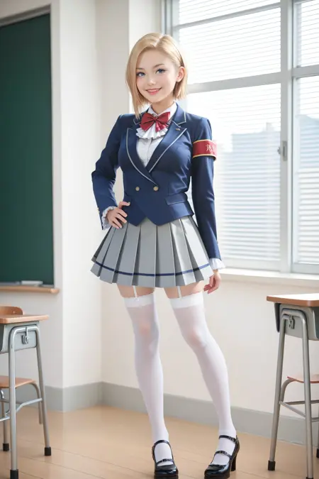 school uniform: school uniform, blazer, long sleeves, red bowtie, ascot, white shirt, armband, pleated skirt, grey skirt, frills, white thighhighs, garter straps, mary janes, high heels