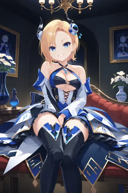medium breasts, blue eyes, blonde hair, asymmetrical bangs,