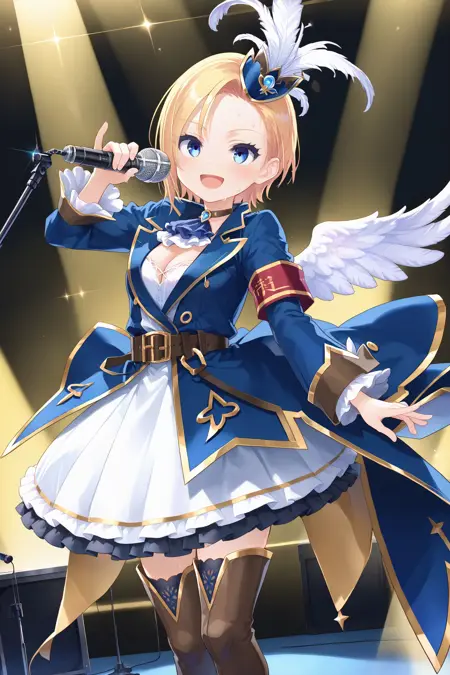 XenosMagica: xenosmagica, hat feather, blue headwear, blue jacket, wing collar, open jacket, choker, ascot, gem, long sleeves, white dress, cleavage, armband, feathered wings, belt, white skirt, thigh strap, thigh boots, high heel boots, brown footwear, gold trim