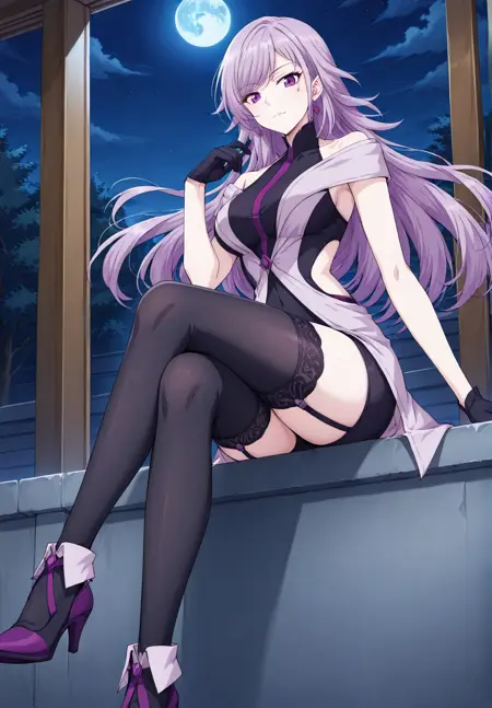 black bodysuit, purple accent outfit, high heels, short gloves, black gloves garter straps, tight clothes, black thighhighs, sleeveless, bare shoulders, collarbone,