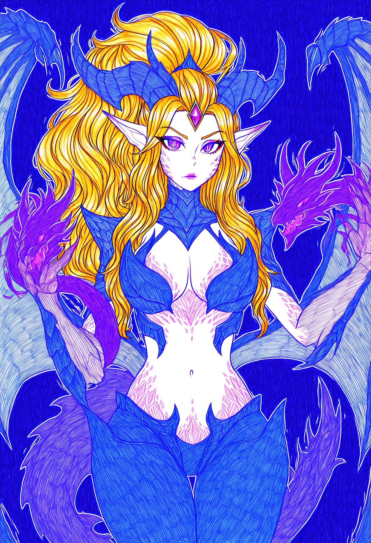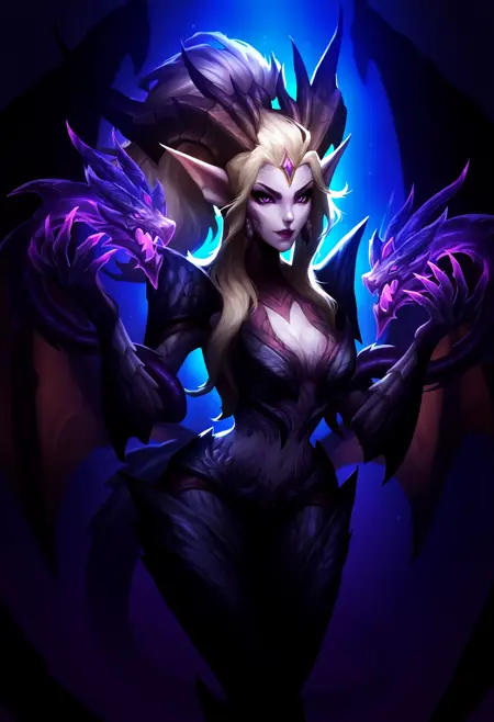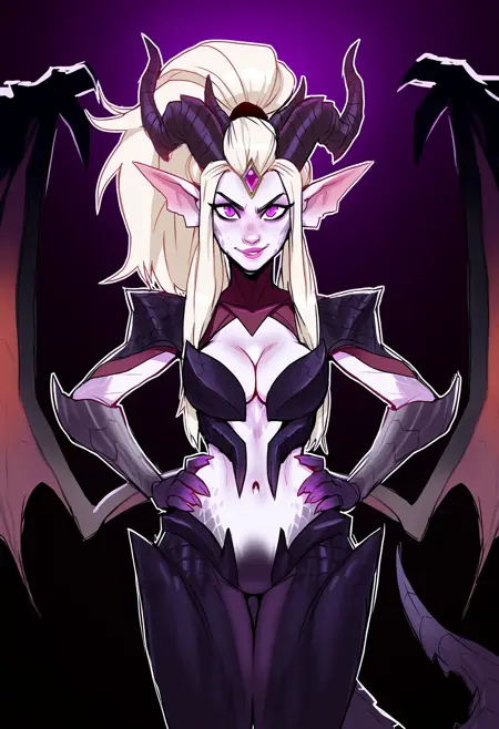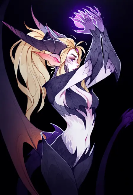| 训练词汇 | dsz, league of legends, colored skin, purple eyes, long hair, blonde hair, ponytail, forehead jewel, purple eyes已复制! tail, wings, horns, pointy ears, monster girl, dragon girl, claws已复制! breasts, medium breasts, cleavage, navel已复制! dragon tentacles, dragon pets已复制! |