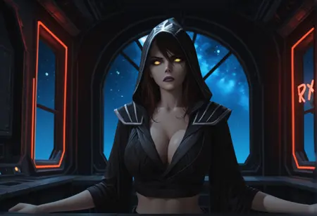 Jaesa, full lips, brown hair, large breasts, yellow eyes, fit and thin, athletic, black sith robes, midriff, cleavage