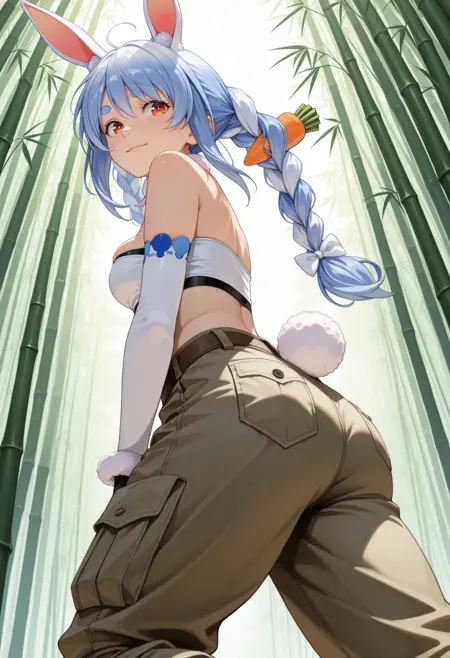 (正面提示词)usada pekora, 兔女郎, 兔耳朵, 兔尾巴, 红眼睛, 长发, 多彩发色, 白发, 蓝发, 双马尾,