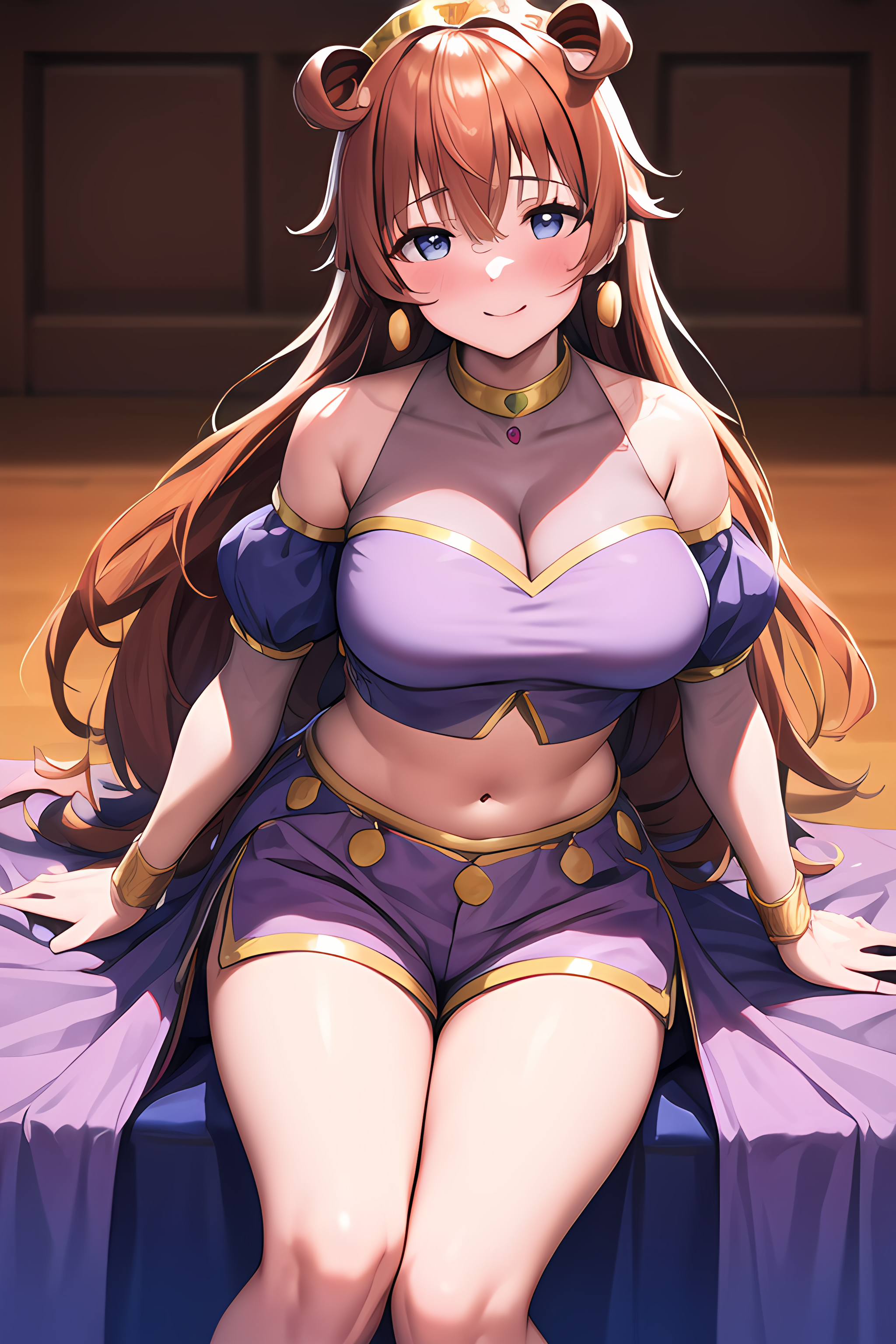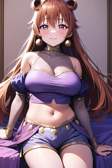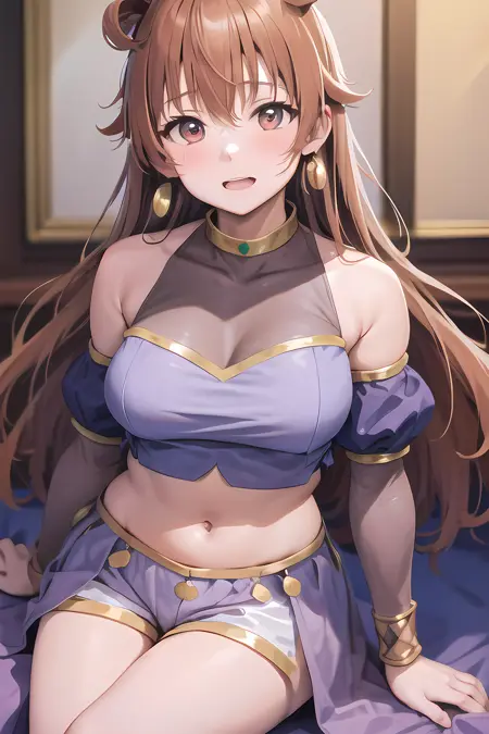- kanata konoe,brown_hair,detached_sleeves, earrings, jewelry, long_hair, looking_at_viewer, midriff, navel,shorts