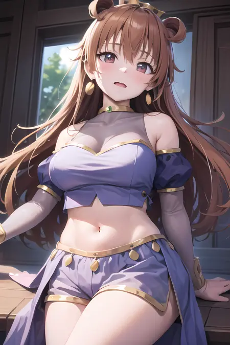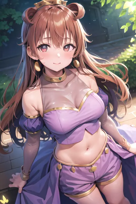 - kanata konoe,brown_hair,detached_sleeves, earrings, jewelry, long_hair, looking_at_viewer, midriff, navel,shorts