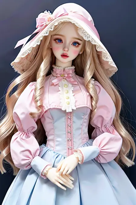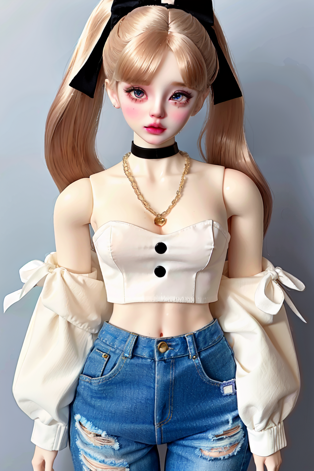 desaturated, dreamy pastel color,a highly detailed, realistic female doll with fair skin, long, straight, light brown hair, and heavy makeup featuring dark eyeliner and pink lipstick. The doll wears a black and white lace bralette with black bows and a silver necklace with a heart-shaped pendant. She has large, expressive eyes and a delicate, youthful face. The background is softly blurred, suggesting a bedroom setting. The image is bright, emphasizing the doll's features and textures.