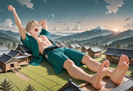 BREAK, <giant: leaning against building>, giant sitting, blonde hair, <- 이 줄은 거대한 인물의 외모와 위치를 설명하는 데 사용할 수 있습니다
