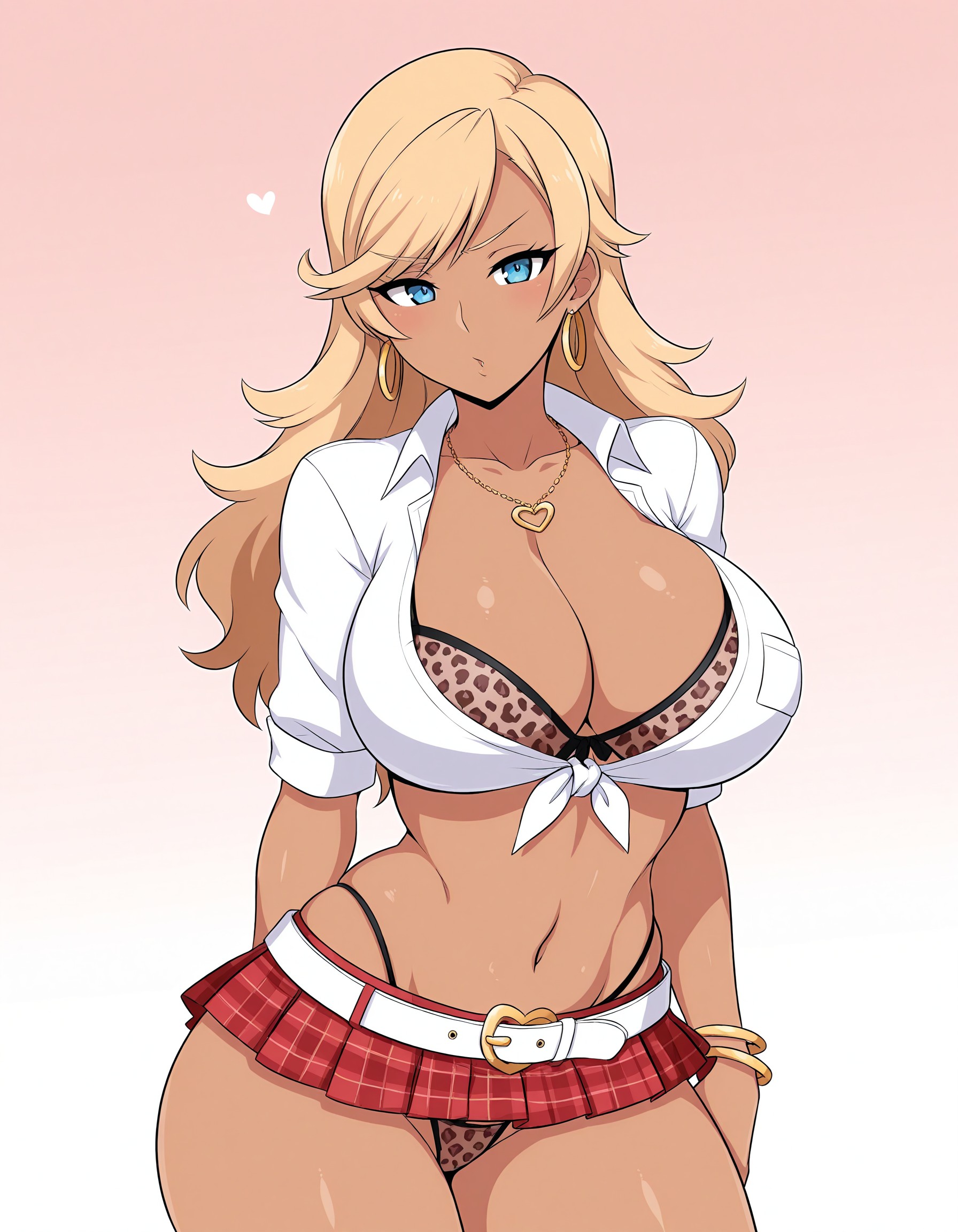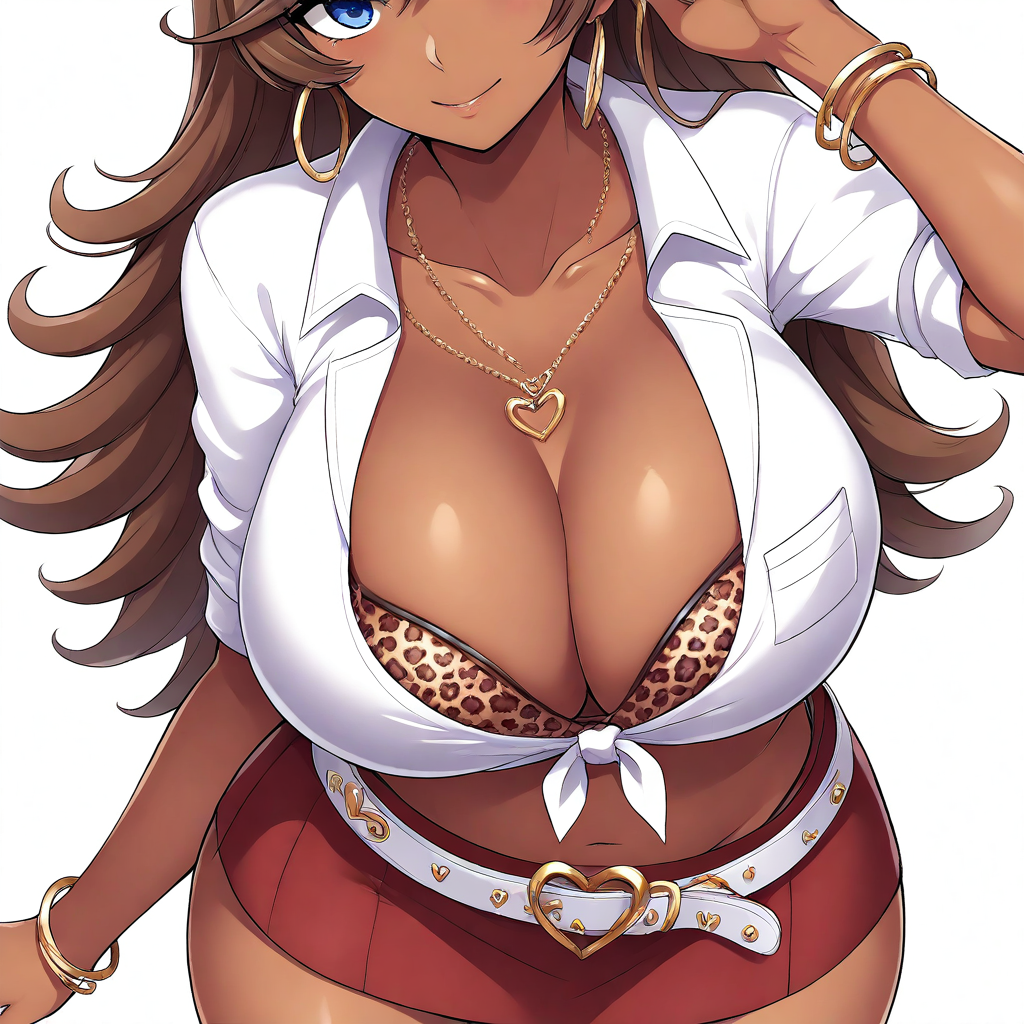 | 학습된 단어 | Anna Sasamori, 5A5AMORI, long hair, semi wavy hair, blonde hair, swept bang, blue eyes, earrings, necklace, bracelet, dark-skinned female, light brown skin, large breasts, navel, collarbone, white shirt, front-tie shirt, leopard print bra, bra visible under shirt, bra cups sticking out, shirt pocket, collared shirt, red microskirt, white belt, leopard print thong, thick thighs, wide hips,복사됨! |