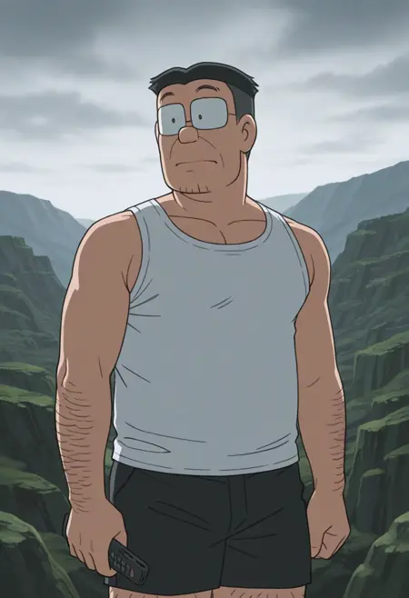 senseiofnobita, mature male, glasses, black hair, black eyes, dot pupils, retro artstyle, plump