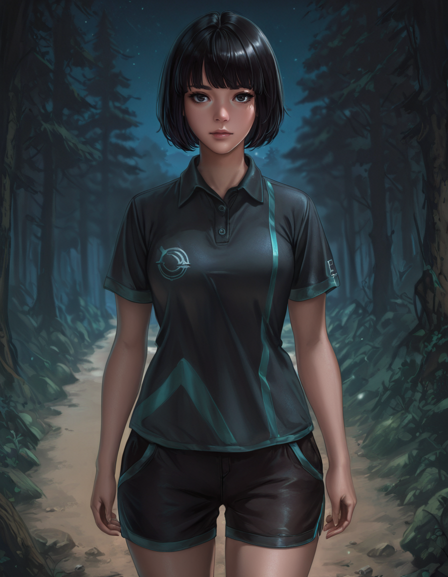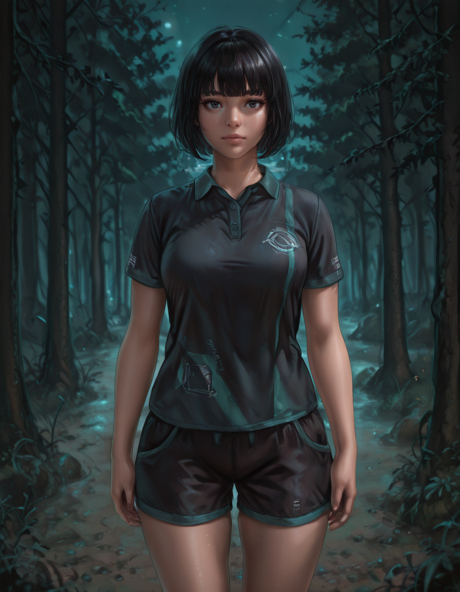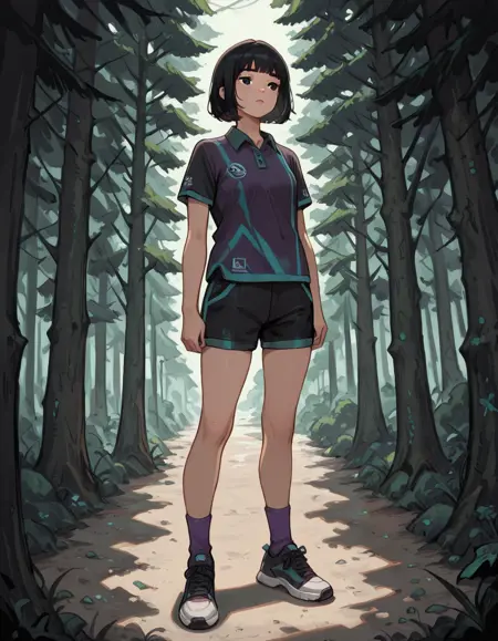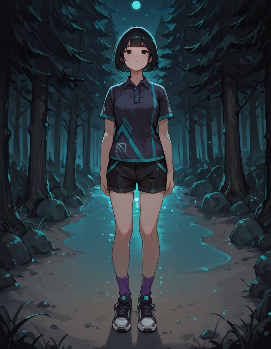 1girl, solo, shorts, shirt, bangs, short sleeves, black eyes, shoes, socks, short hair, black shorts, black hair, feng