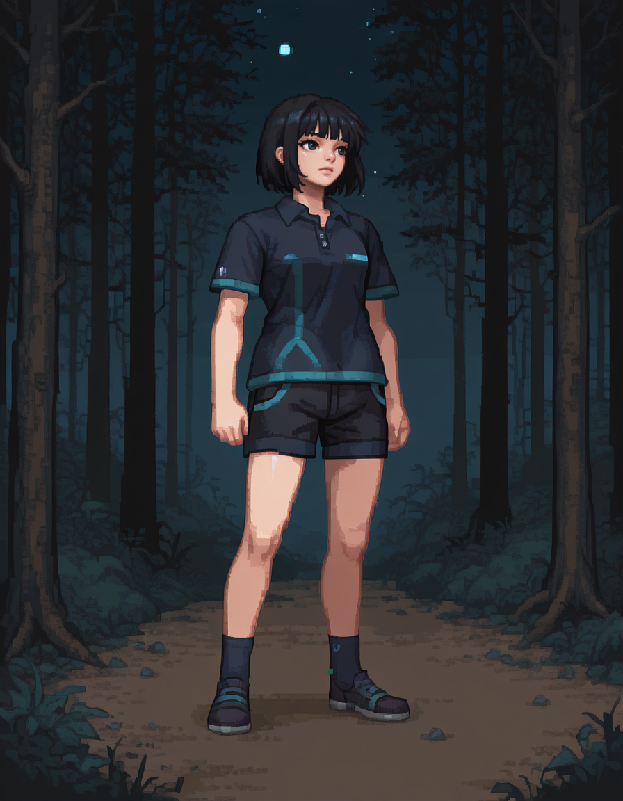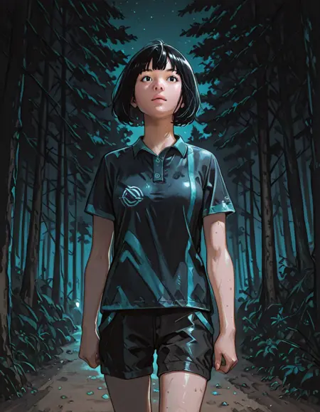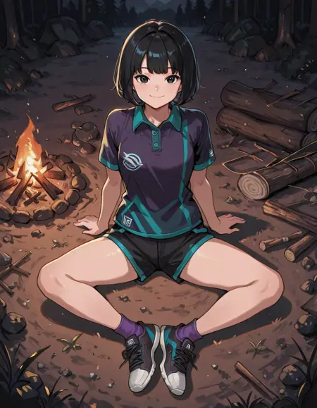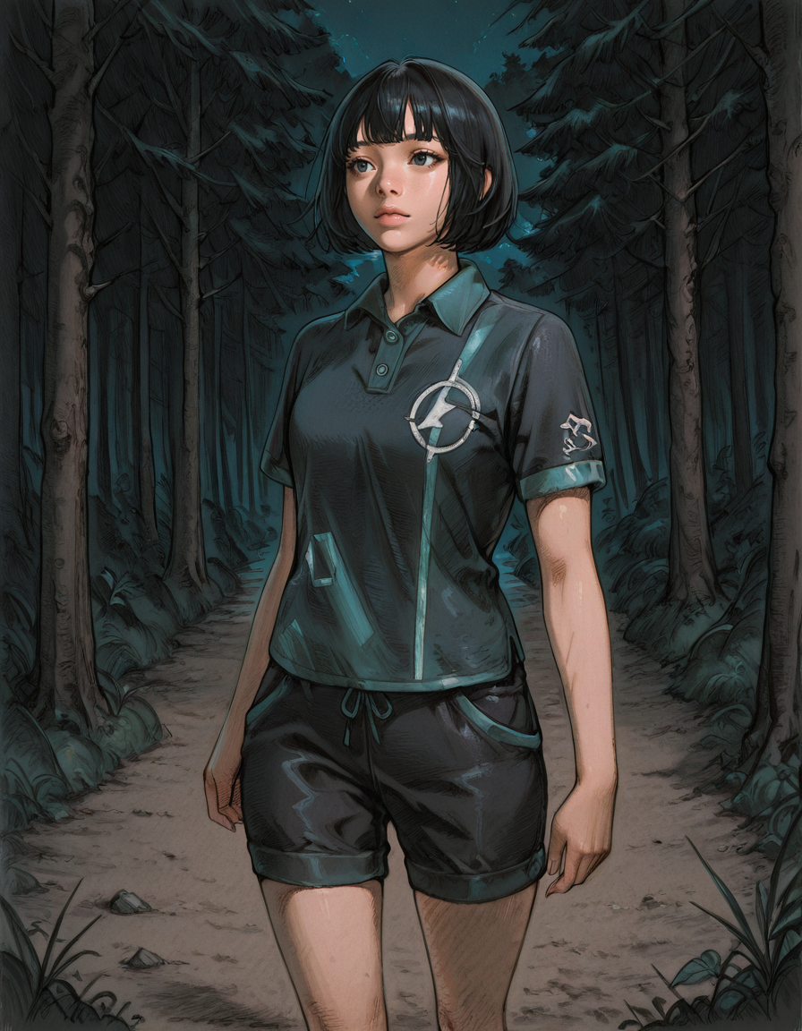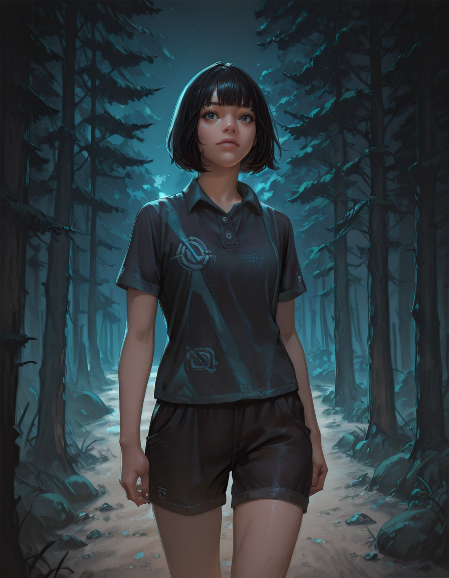 1girl, solo, shorts, shirt, bangs, short sleeves, black eyes, shoes, socks, short hair, black shorts, black hair, feng