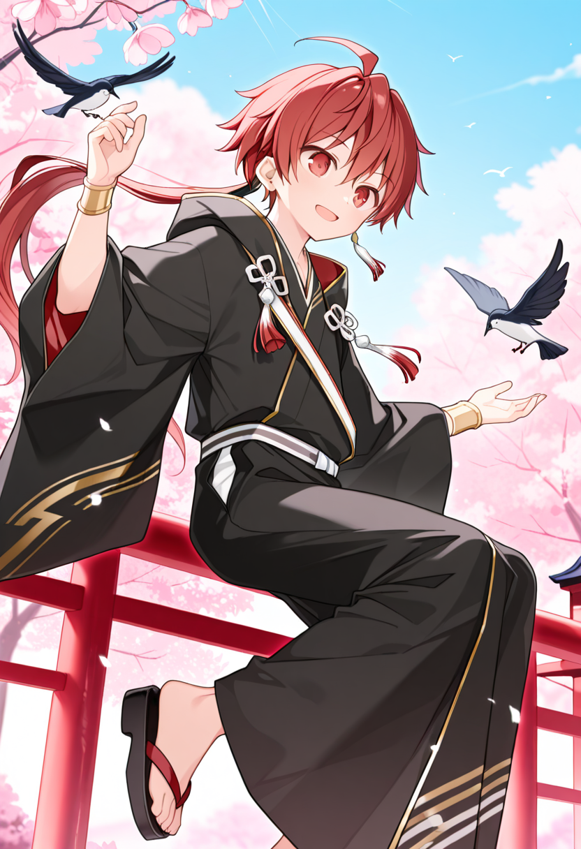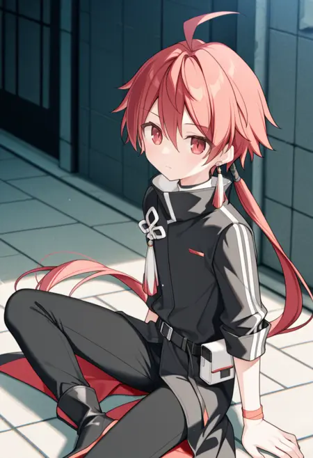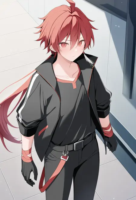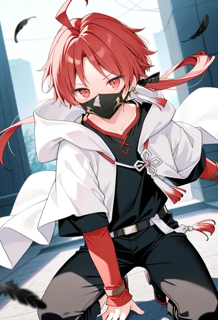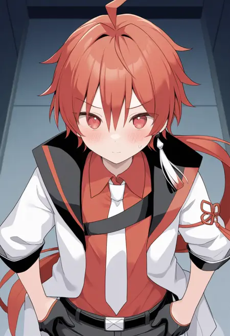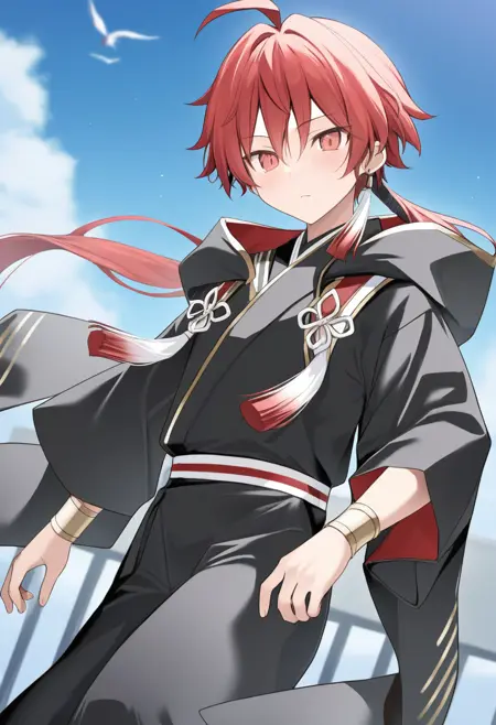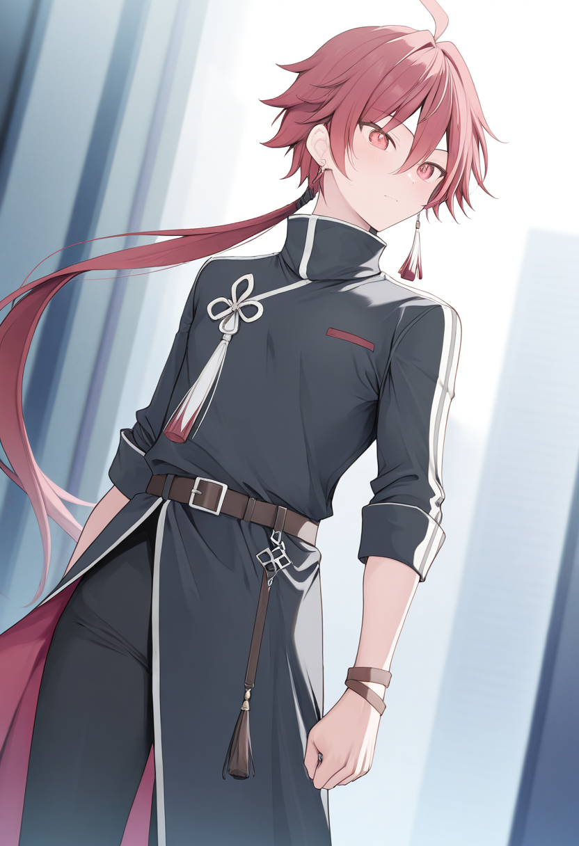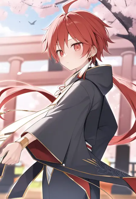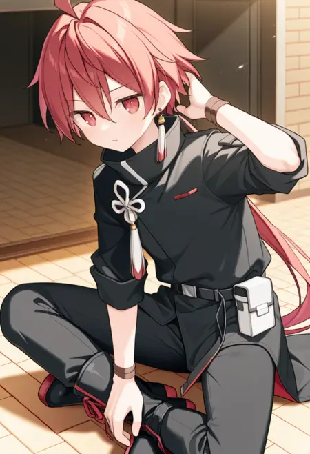 akatsuki(maimai), 1boy, {짧은 머리 | 중간 길이 머리}, 빨간 눈, {아호게 | 안테나 헤어}, 단일 뒤로 묶은 머리, 빨간 머리, 낮은 뒤로 묶은 머리, 길게 묶인 머리, 귀걸이, 깃털 귀걸이, 한쪽 귀걸이, 검은 신발, 부츠,