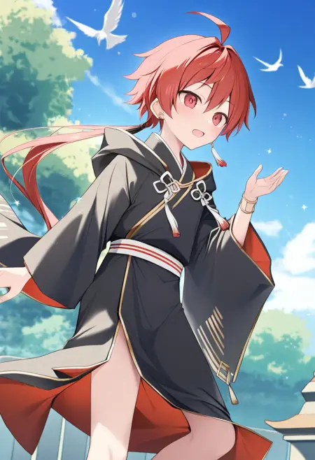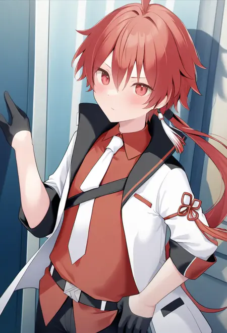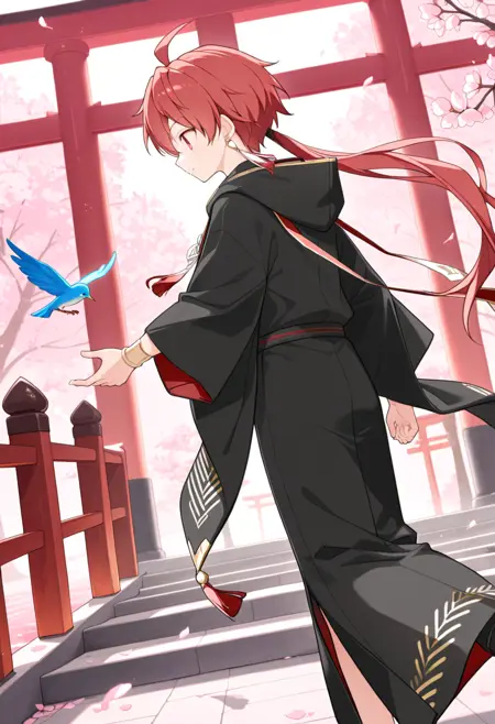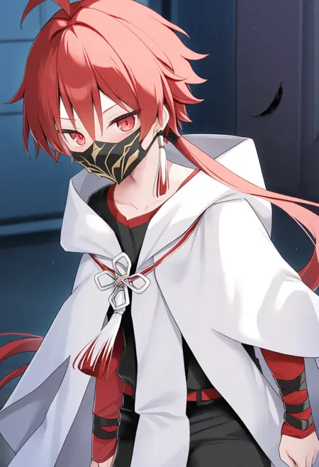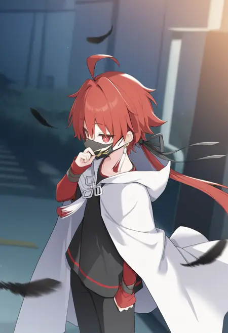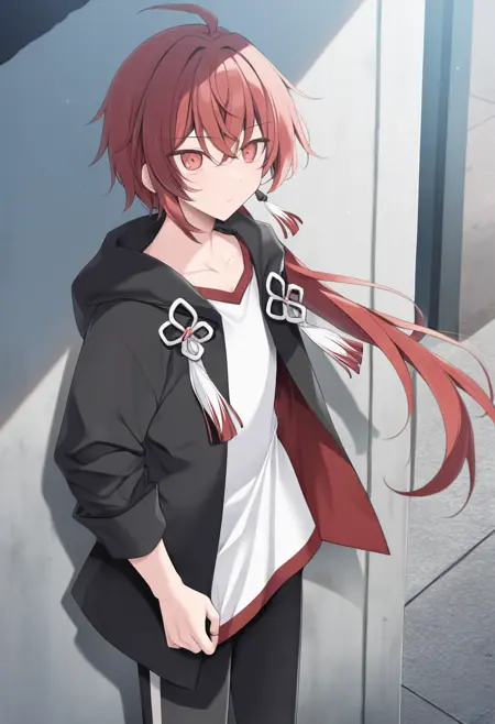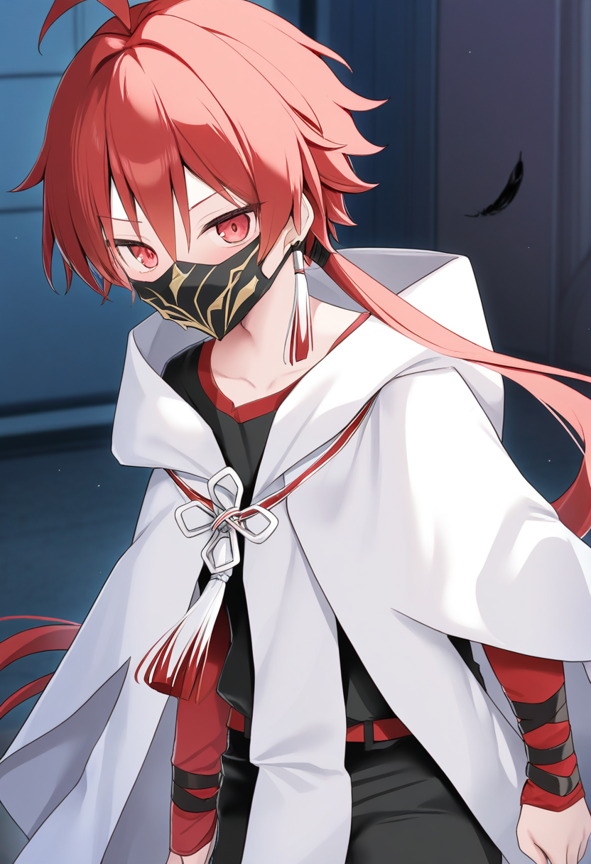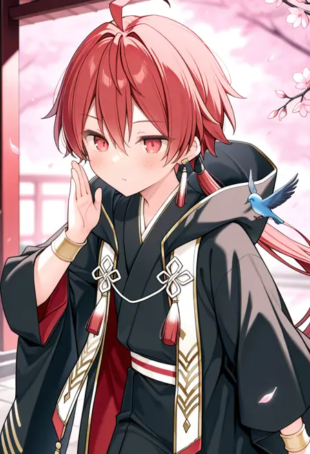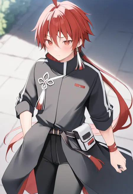 akatsuki(maimai), 1boy, {짧은 머리 | 중간 길이 머리}, 빨간 눈, {아호게 | 안테나 헤어}, 단일 뒤로 묶은 머리, 빨간 머리, 낮은 뒤로 묶은 머리, 길게 묶인 머리, 귀걸이, 깃털 귀걸이, 한쪽 귀걸이, 검은 신발, 부츠,