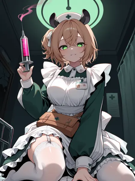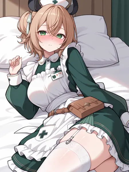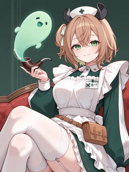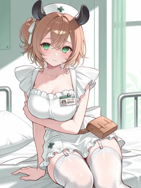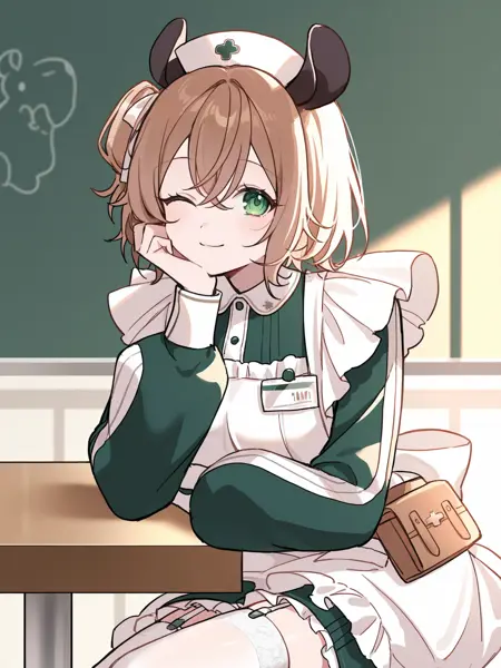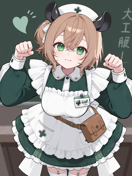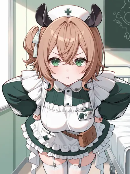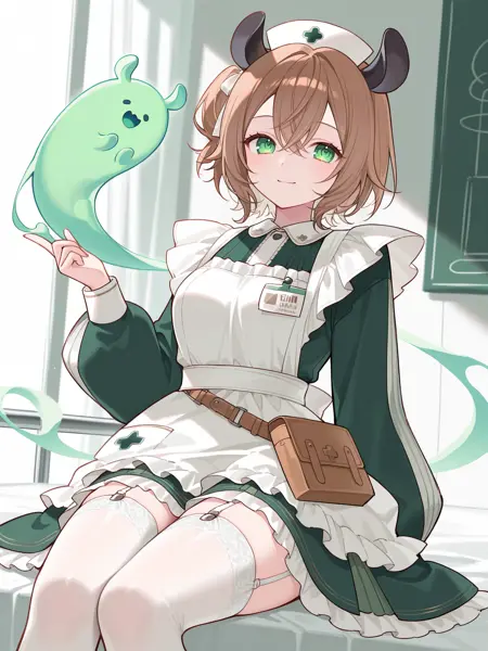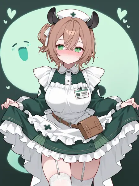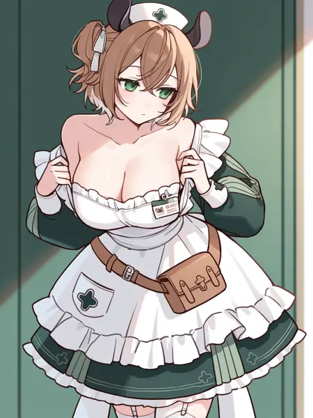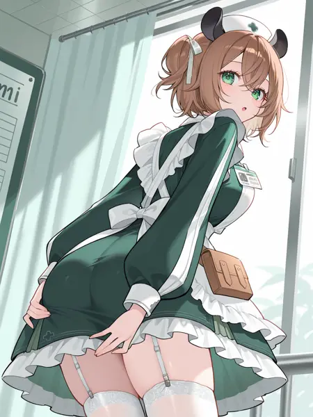 1st outfit: vtnimi, green eyes, short hair, brown hair, one side up, white hair ribbon, tapir ears, medium breasts, nurse cap, green dress, collared dress, puffy long sleeves, white apron, id badge, waist bag, white thighhighs, garter straps, frilled apron, frilled dress