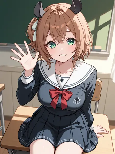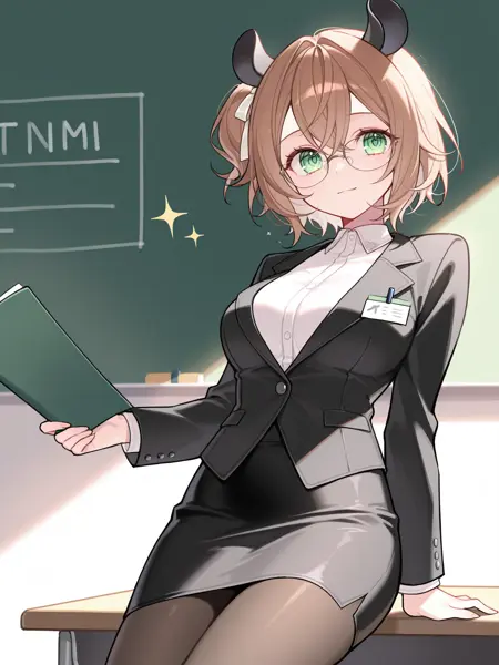 Apperance: vtnimi, green eyes, short hair, brown hair, one side up, white hair ribbon, tapir ears