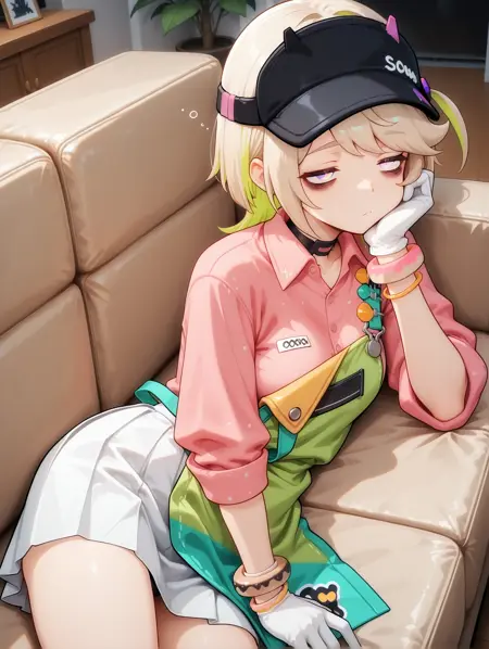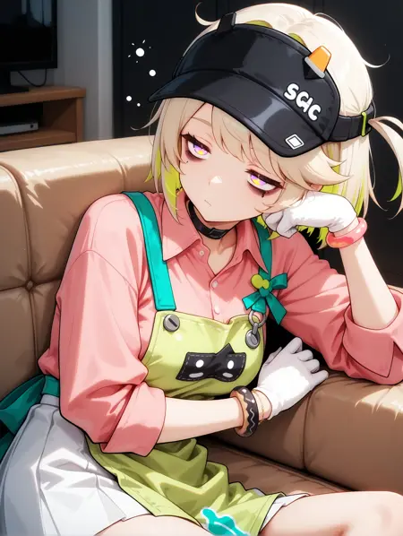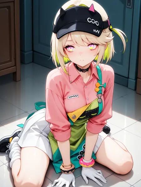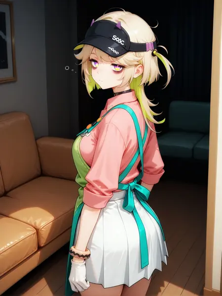 의상 트리거: 셔츠, 핑크 셔츠, 에프론, 칼라 셔츠, 체인, 장갑, 뷰저 캡, 검은 헤드웨어, 치마, 모자, 팔찌, 흰 장갑, 흰 치마, 느슨한 양말, 신발