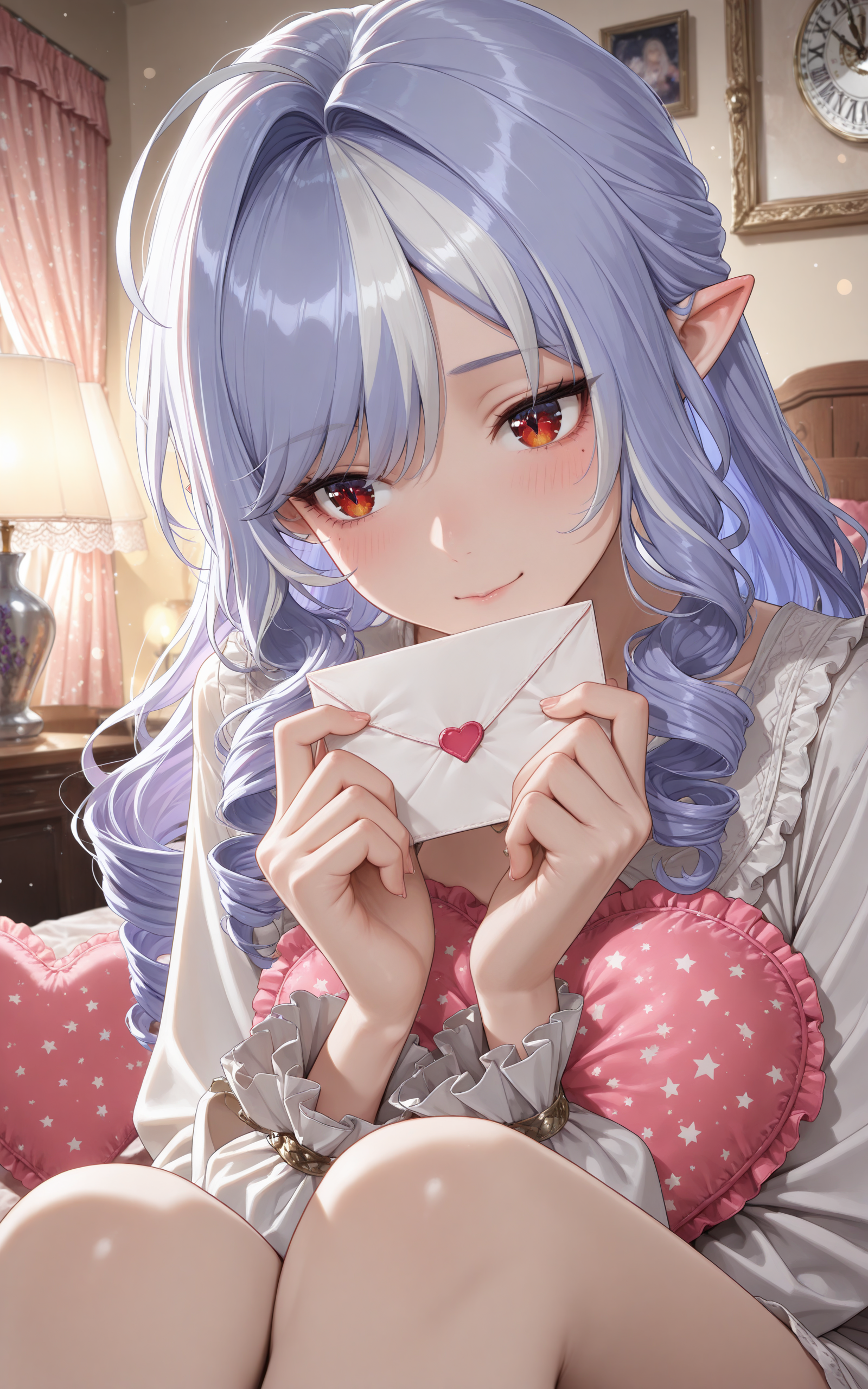 全身:vivian\(zenless zone zero\),1girl,solo,long hair,drill hair,blue hair,white hair,purple hair,multicolored hair,bangs,red eyes,mole under eye,pointy ears, breasts,medium breasts,lolita fashion,gothic lolita,bowtie,ascot,long sleeves,underbust,corset,frills,center frills,nail polish,black nails,pantyhose,black pantyhose,ankle ribbon,ribbon,black footwear,