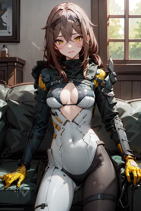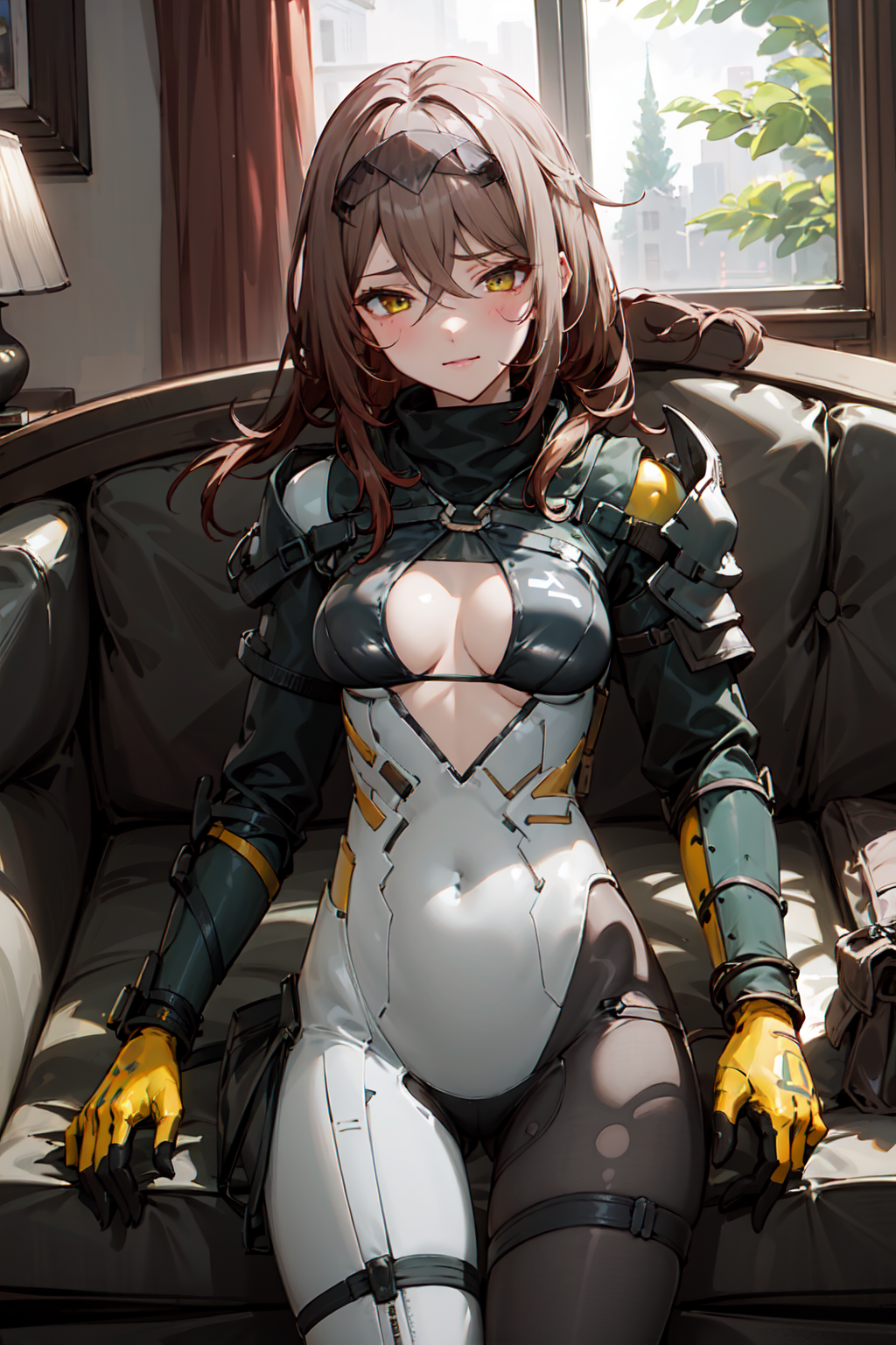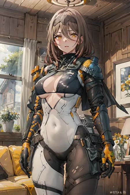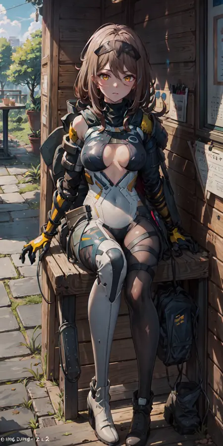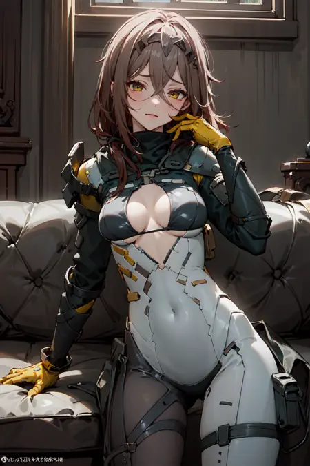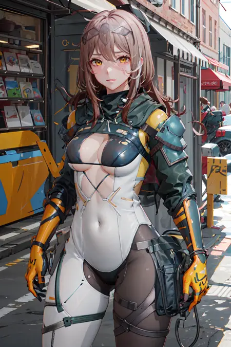 ポジティブプロンプト:qingS、1girl、bodysuit、asymmetrical legwear、single mechanical arm、long_sleeves、cowl、gloves、headdress、shoulder_armor、boots、brown hair、long hair、yellow eyes、