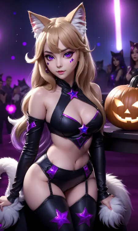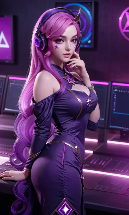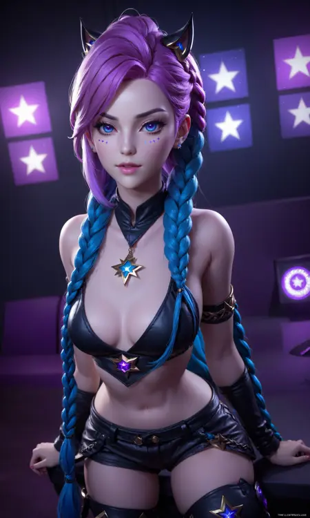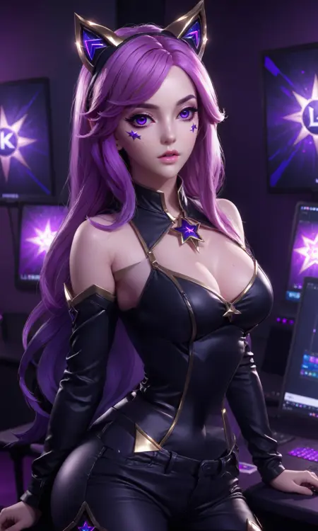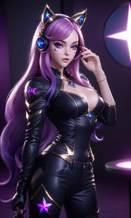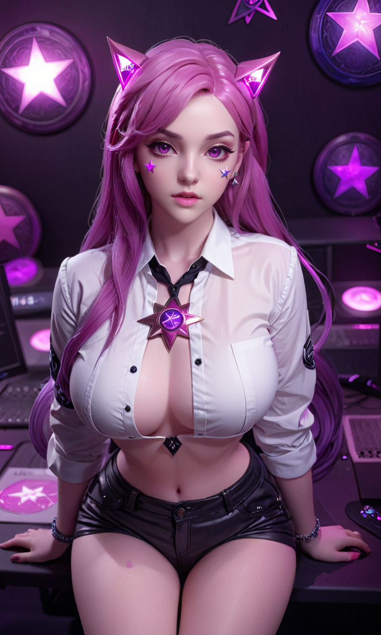 起手tag(Start tag):best quality,masterpiece,realistic,full body,1girl,pink hair,k/da (league of legends),3D graphics,there is a star below the left eye,