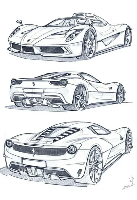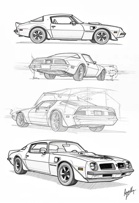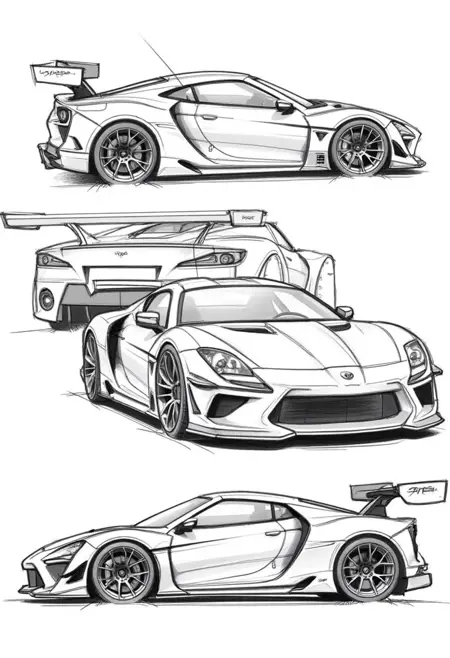 손으로 그린 자동차 콘셉트를 생성: 여러 각도, 분해도, 도면과 유사한 선작업. 구조선, 주석, 다양한 스케치 단계(단순한 스케치 초안에서 정교한 정사영 도면까지)를 기대하세요.