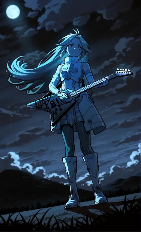 lcherosuit、ギター・ボウを手に持つ、ボウを引く、インラインスケート、