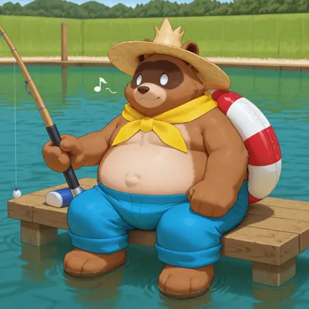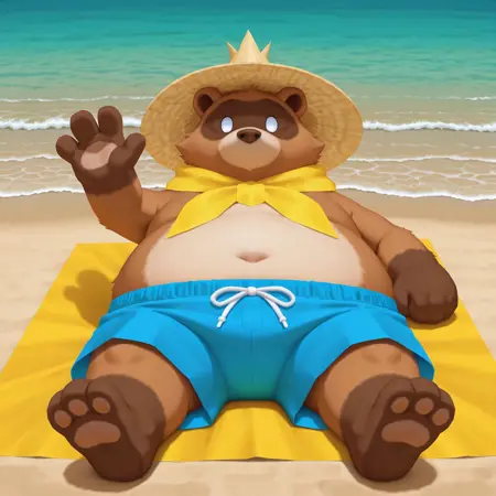 Tags to use: tanuki, brown fur, yellow neckerchief, white eyes, no sclera, blue swimming trunks, 3 toes, featureless hands, beige muzzle, brown nose, beige countershade torso, straw hat, animal ears, dark brown inner ears, fat