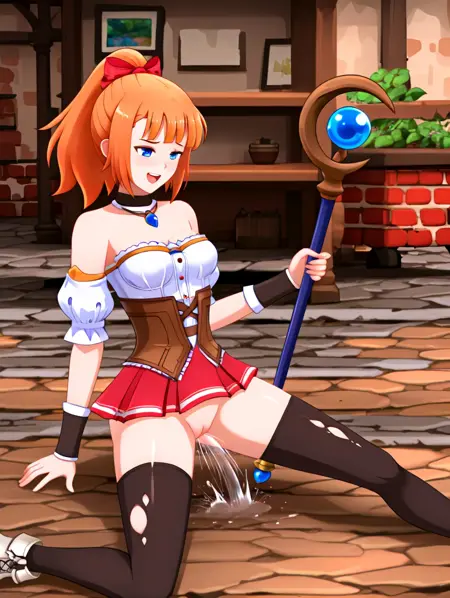 第一次尝试就意外地不错!woohoo!使用 "ateliertia,blue eyes,orange hair,ponytail,thighhighs,red skirt,white blouse" 可以轻松获得主角和服装。