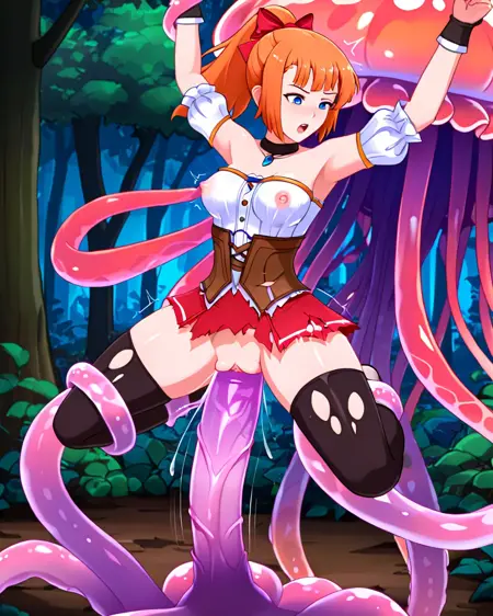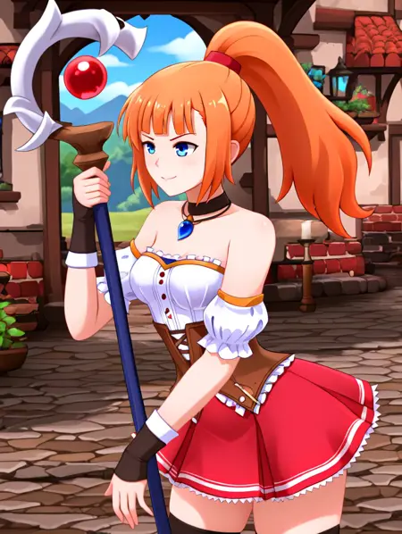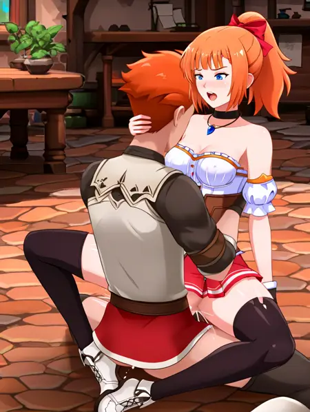 Came out surprisingly well for the first try woohoo! "ateliertia,blue eyes,orange hair,ponytail,thighhighs,red skirt,white blouse" will get you the main character and outfit pretty easily.
