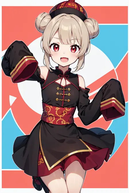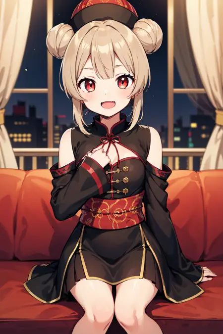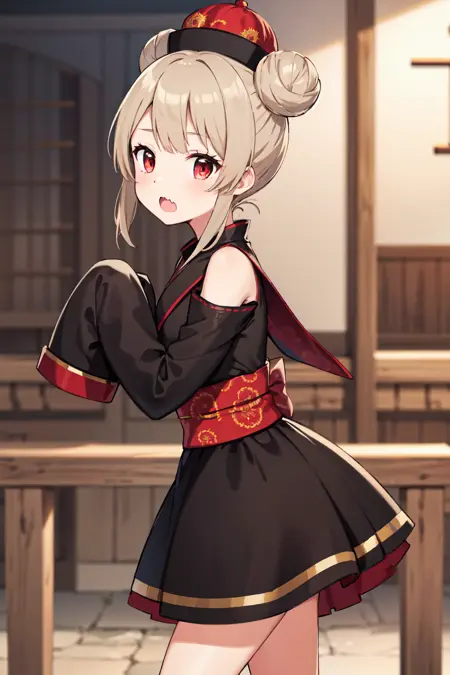 衣装3bbsana, 短い髪, 二つ結び, 帽子, 赤色の頭部装具, 尖った歯, 中国風衣装, 黒いドレス, 衣装のカットアウト, 長袖, 袖が手首より長い, 袖が指先より長い, 帯