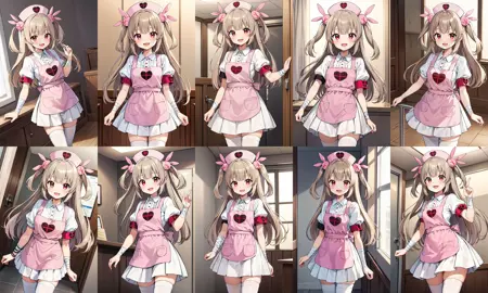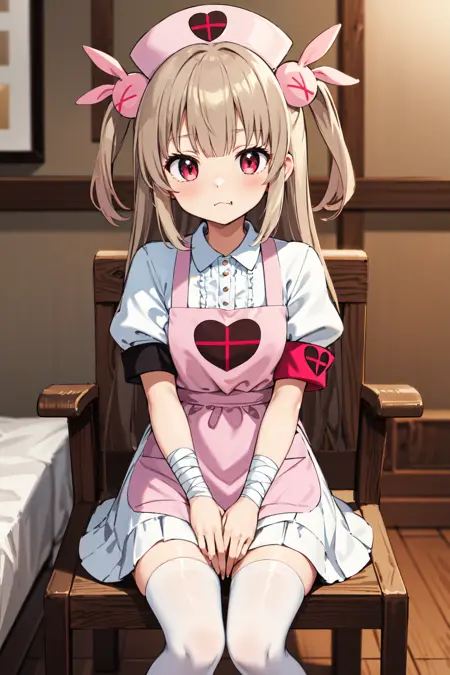 衣装1aasana, 長い髪, 両サイドアップ, 髪飾り, 看護師キャップ, ピンク色の頭部装具, 尖った歯, ポロシャツ, 白シャツ, フリフリの短い袖, 包帯巻きの腕, ピンク色のエプロン, 白スカート, 白色の太ももまであるストッキング