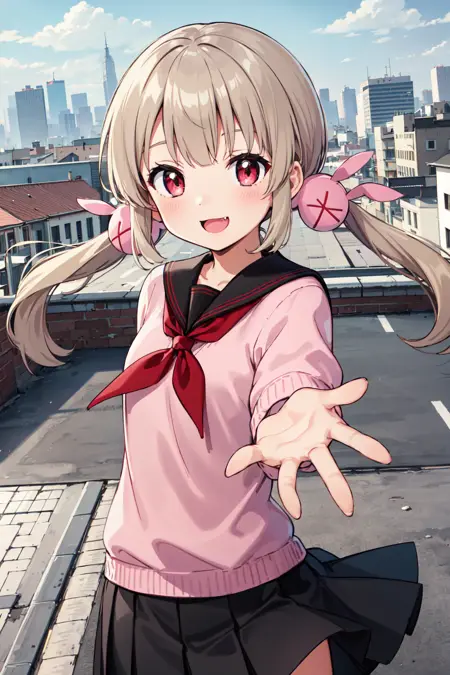 衣装2aasana, 長い髪, 低めのツインテール, 髪飾り, 尖った歯, 学校制服, 黒いセーラーカラー, 赤いネクチーフ, ピンク色のセーター, 長袖, 袖が手首より長い, 腕章, 黒スカート, プリーツスカート