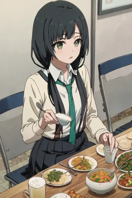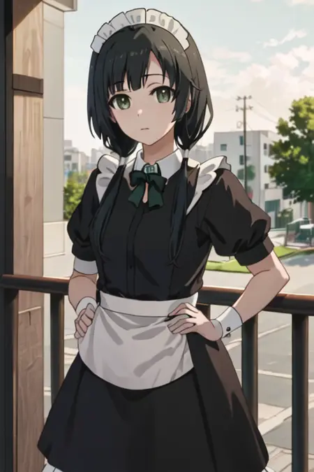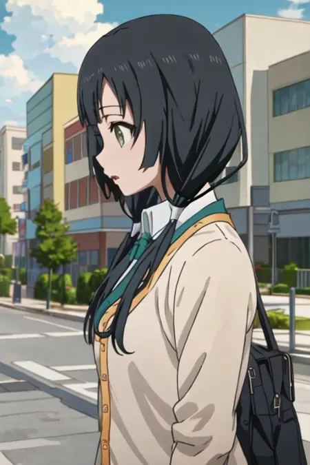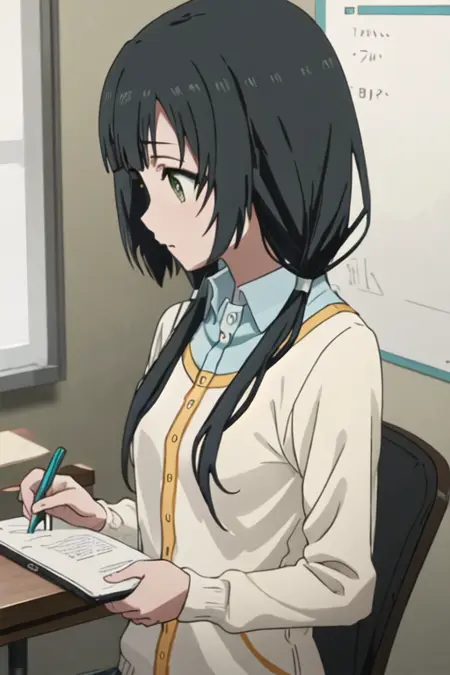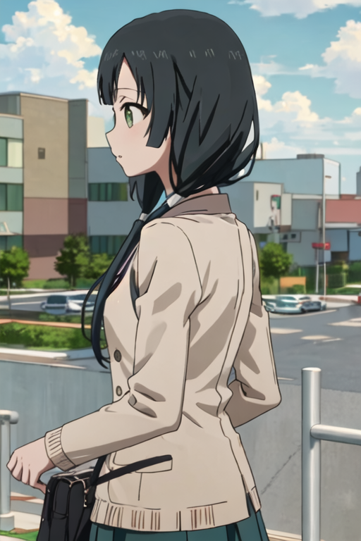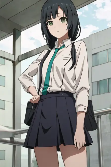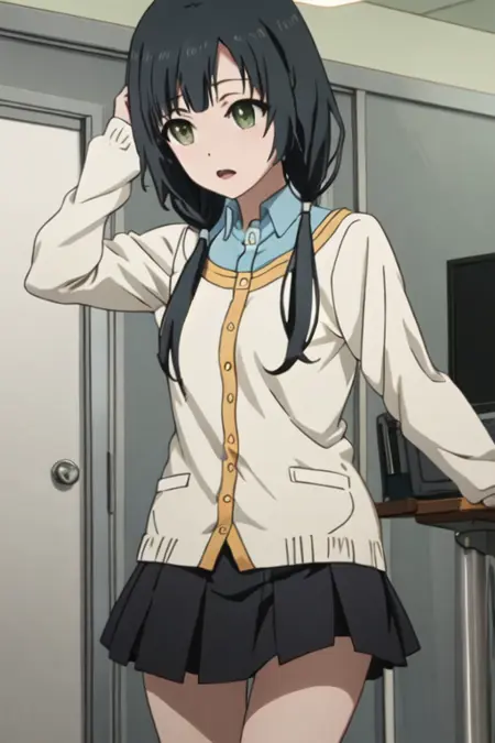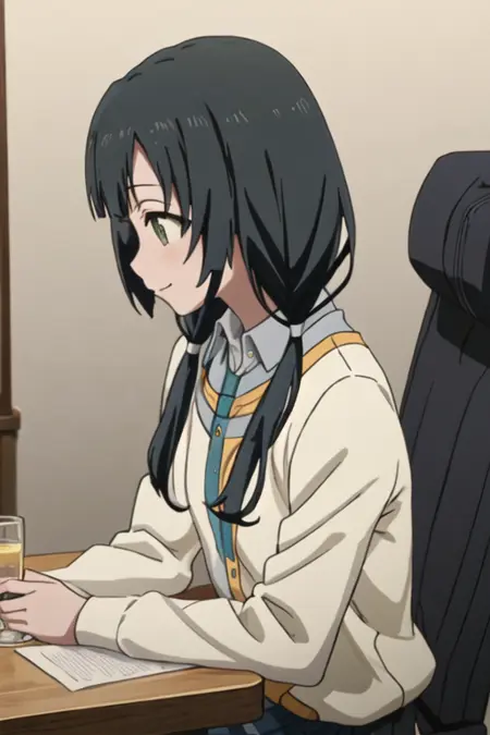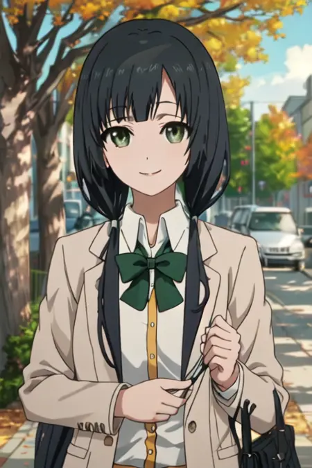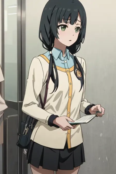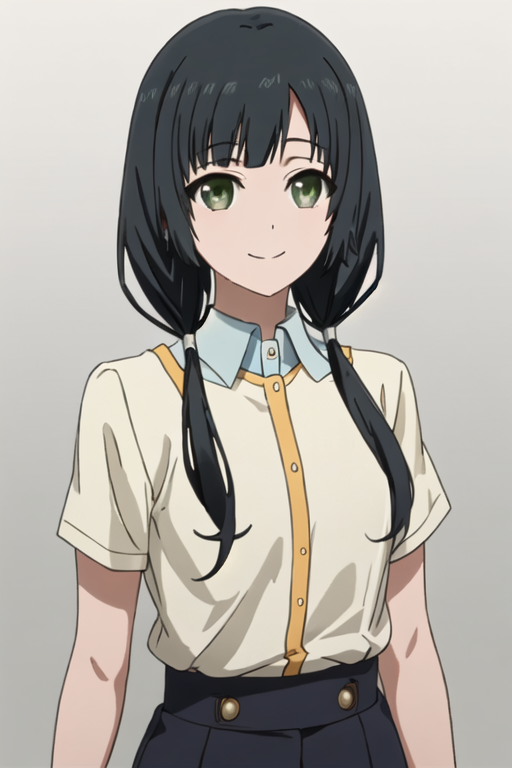 触发词为 yasuhara_ema_shirobako,推荐标签为:best quality, masterpiece, highres, solo, {yasuhara_ema_shirobako:1.15}, black_hair, low_twintails, twintails, long_hair, green_eyes, bangs。