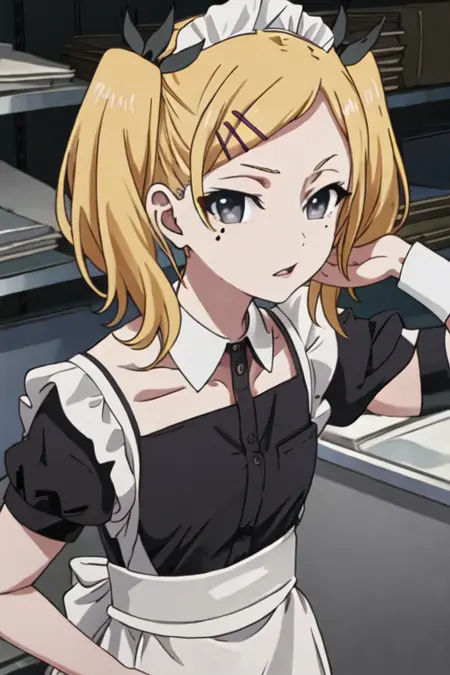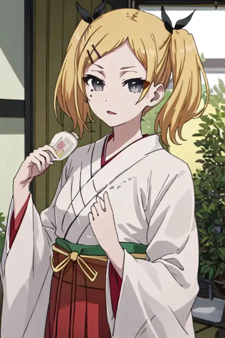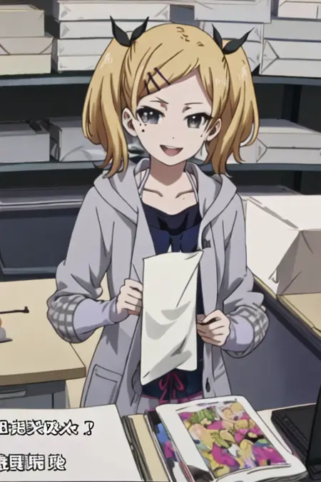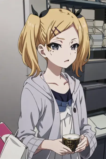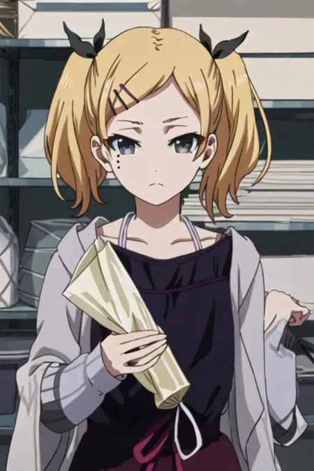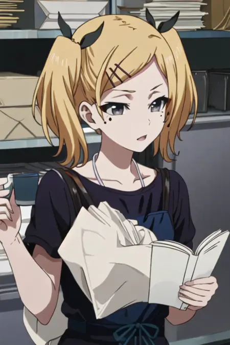 触发词为 yano_erika_shirobako,推荐标签为:best quality, masterpiece, highres, solo, {yano_erika_shirobako:1.15}, blonde_hair, twintails, hair_ornament, hairclip, ribbon, mole, mole_under_eye, hair_ribbon, short_twintails, short_hair, grey_eyes。