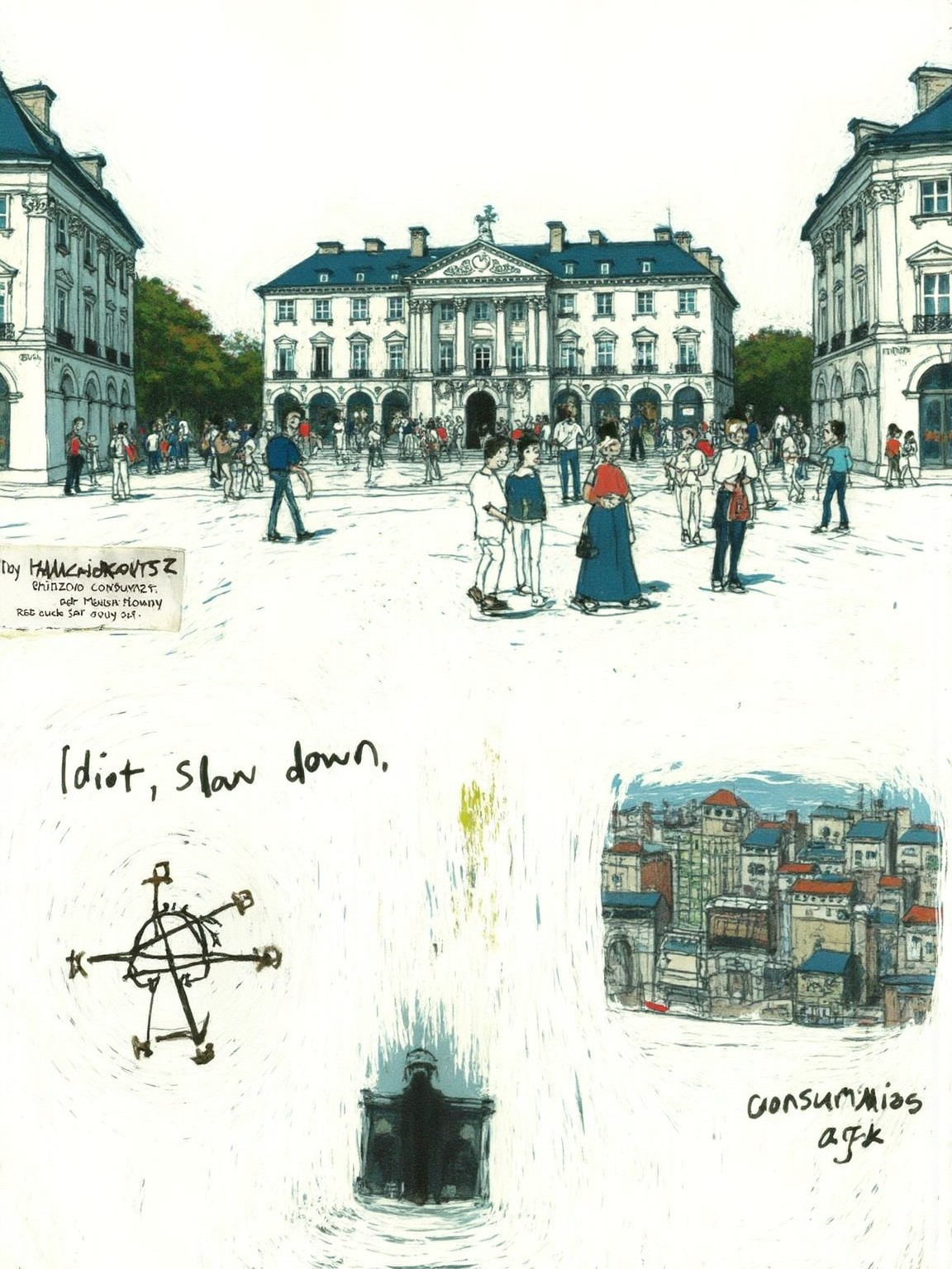 collage, bold black X on a blue square, surreal, silhouette, wireframe, sketches, symbols, ghostly, text, blue-toned, handwritten phrases, chaotic text, Glowing silhouettes, Ghostly silhouettes, Ghostly figures, highway, retro-styled, bar graphs, diagrams, small text, bold text, consumerism, desaturated, scratchy textures, Ethereal figures, "Lost Child", schematic-style illustration, stick figures, scribbles, cityscapes, dreamy, dreamlike, dreamscape, translucent figures, layered, text fragments, abstract marks, airplane, diagrams, chaotic, technical diagrams, white background, silhouetted, cryptic warning labels, neon-outlined, haunting, dreamscape, chaotic, scrawled, text fragments