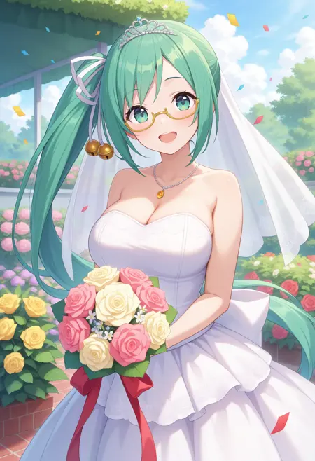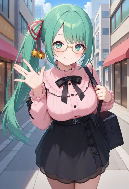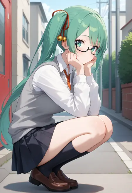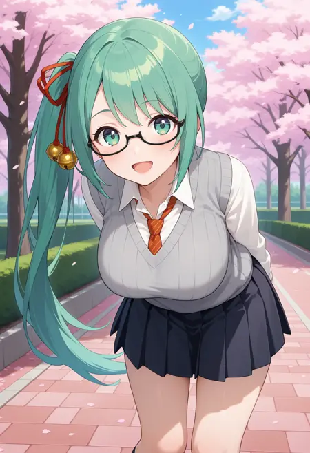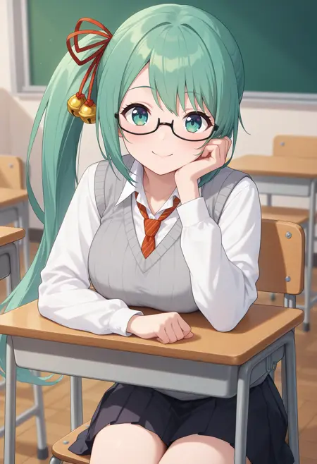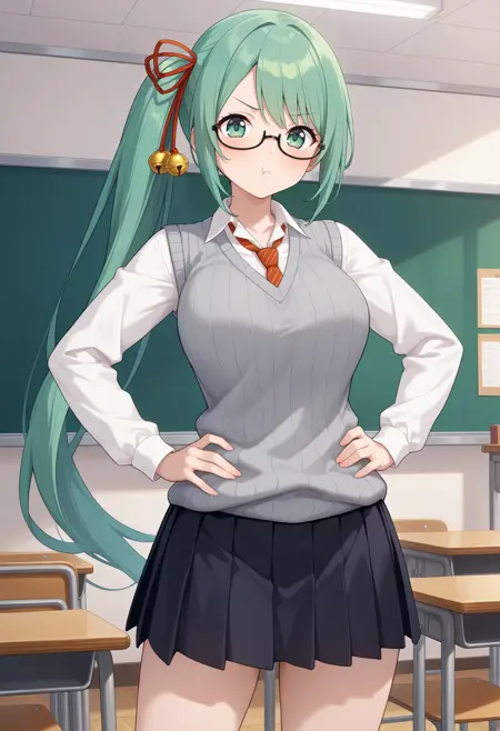 outfit3aasuzu, long hair, green hair, side ponytail, hair ribbon, hair bell, green eyes, glasses, school uniform, red necktie, collared shirt, white shirt, sweater vest, grey sweater, long sleeves, pleated skirt, black skirt