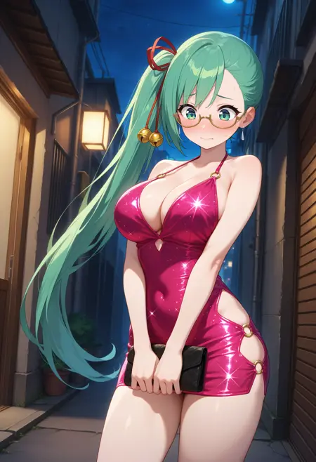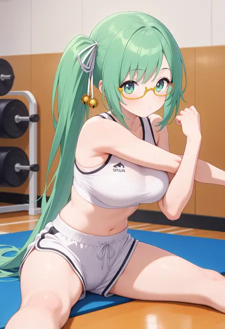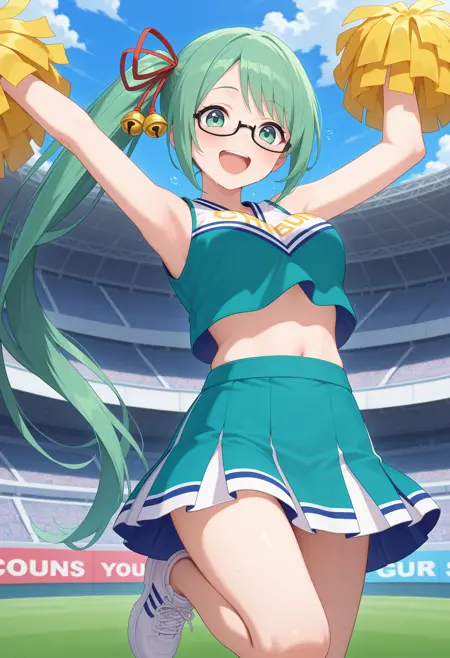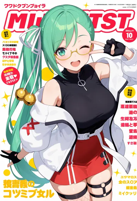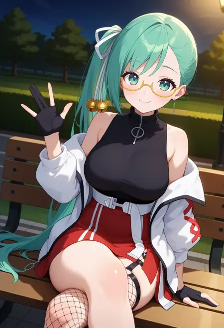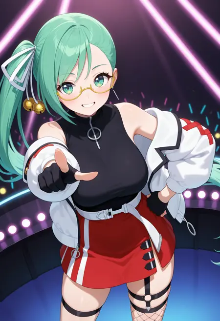 outfit2aasuzu, long hair, green hair, side ponytail, hair ribbon, hair bell, green eyes, glasses, black shirt, sleeveless, white jacket, long sleeves, partially fingerless gloves, black gloves, white belt, red skirt, thigh strap, single thighhigh, fishnet thighhighs