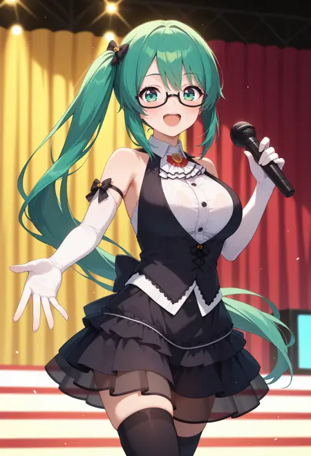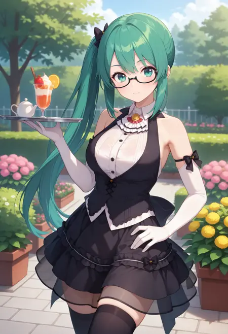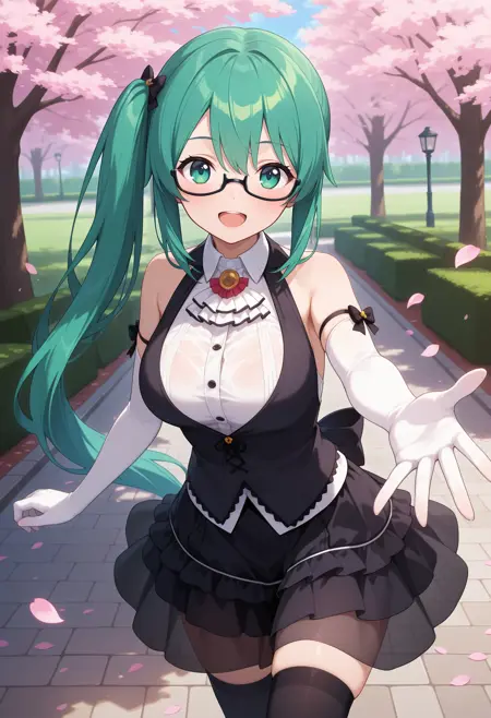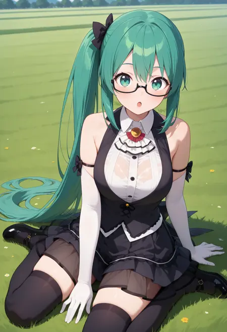 outfit1aasuzu, long hair, green hair, side ponytail, hair bow, green eyes, glasses, white ascot, collared shirt, white shirt, black vest, sleeveless, black bow, elbow gloves, white gloves, black skirt, see-through, black thighhighs