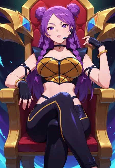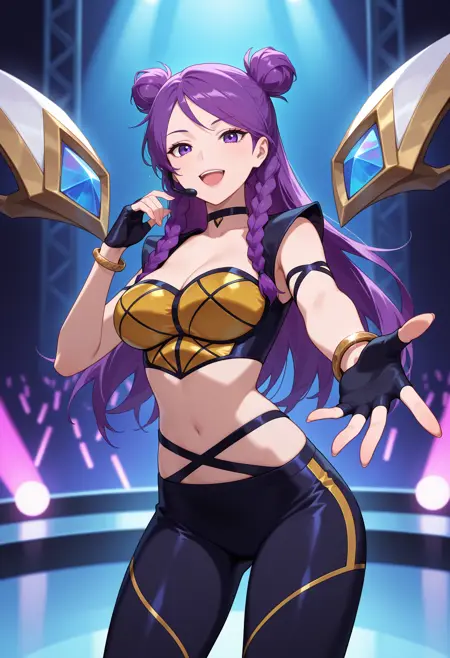 outfit2bbkaisa, long hair, purple hair, double bun, twin braids, headset, purple eyes, black choker, crop top, yellow shirt, sleeveless, arm strap, bracelet, fingerless gloves, black gloves, midriff, tight pants, black pants