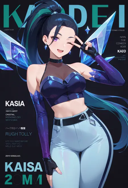 outfit4cckaisa, long hair, multicolored hair, black hair, green hair, high ponytail, hair pulled back, earrings, purple eyes, crystal, choker, bare shoulders, see-through cleavage, crop top, blue shirt, detached sleeves, fingerless gloves, black belt, light blue pants