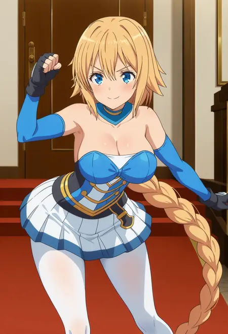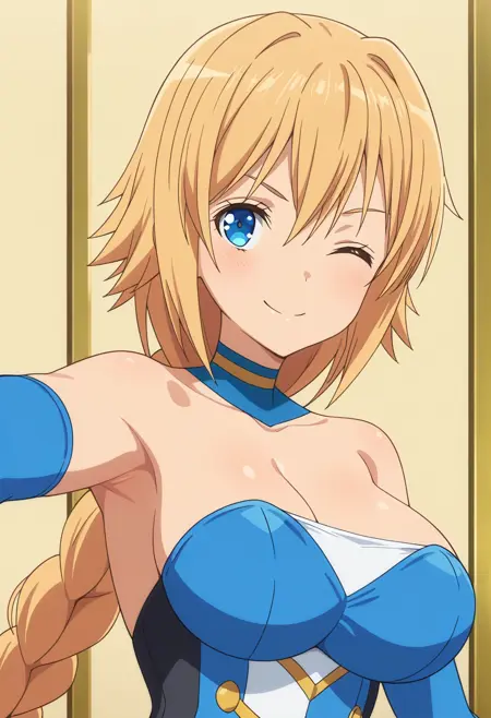dancho_arthur, dancho_uniform, blonde hair, very long hair, single braid, long braid, blue eyes, breasts,