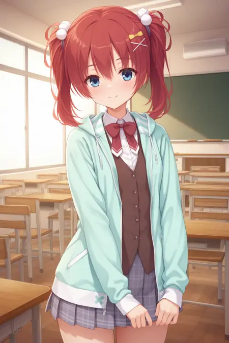 aachisaki、青い目、赤い髪、ツインテール、ポンポン髪飾り、x髪飾り、制服、赤いネクタイ、白いシャツ、茶色のベスト、ボタン、アクア色のパーカー、開いたパーカー、グレーのスカート、チェック柄スカート、プリーツスカート、