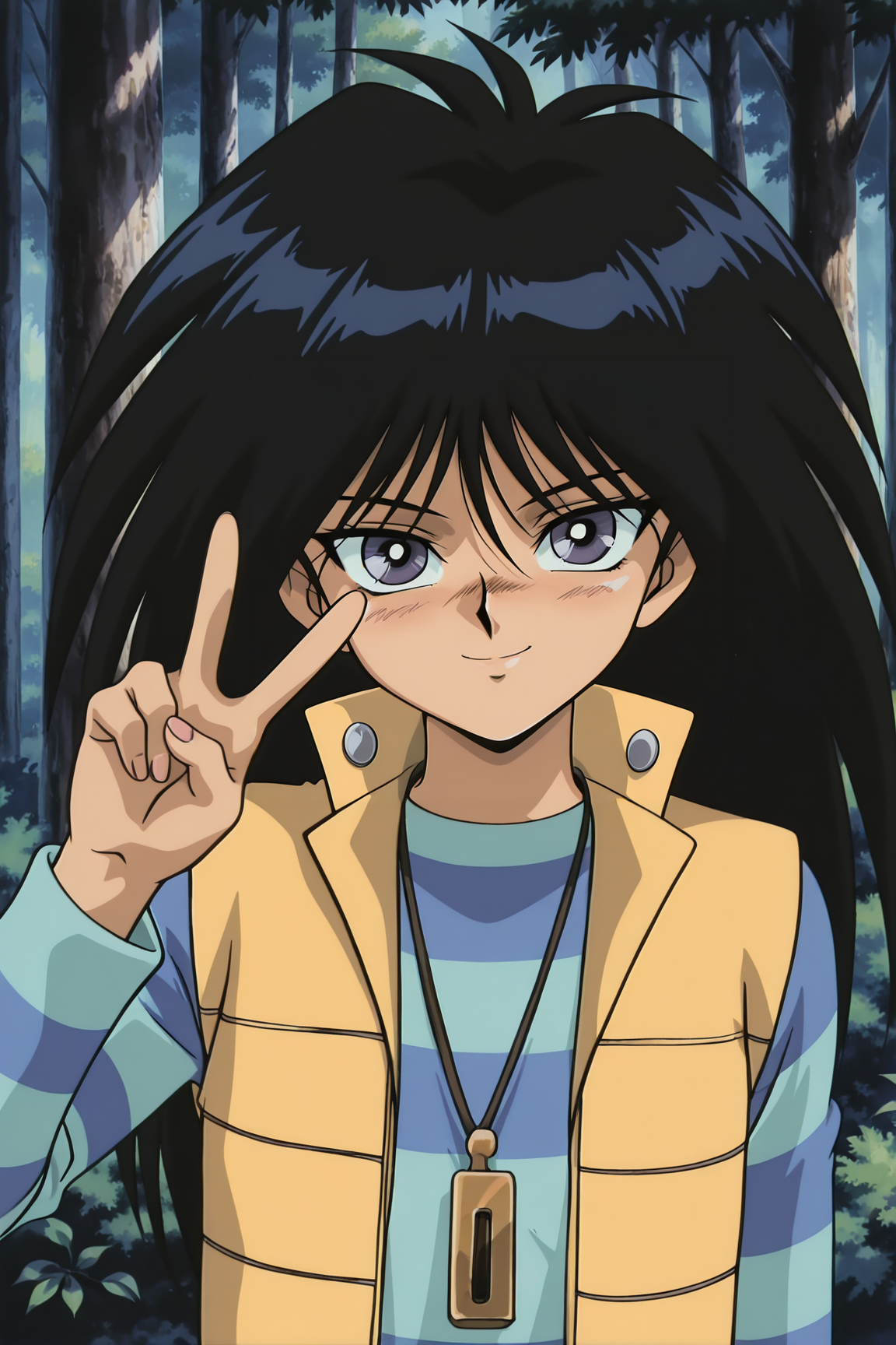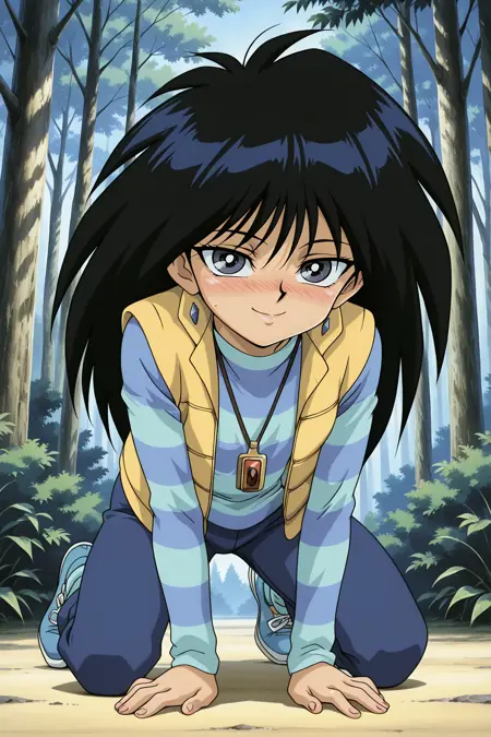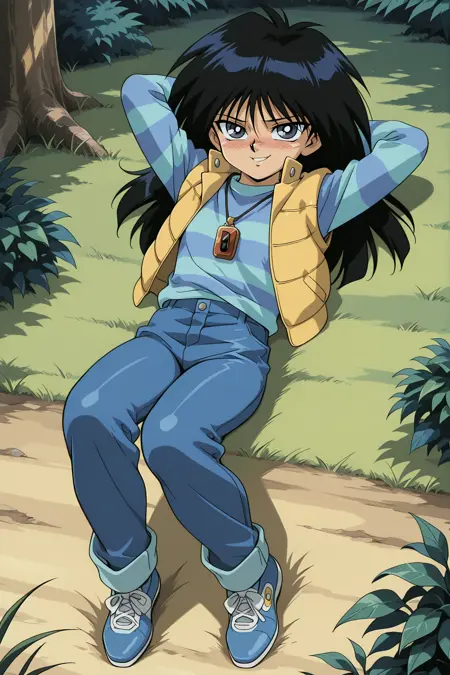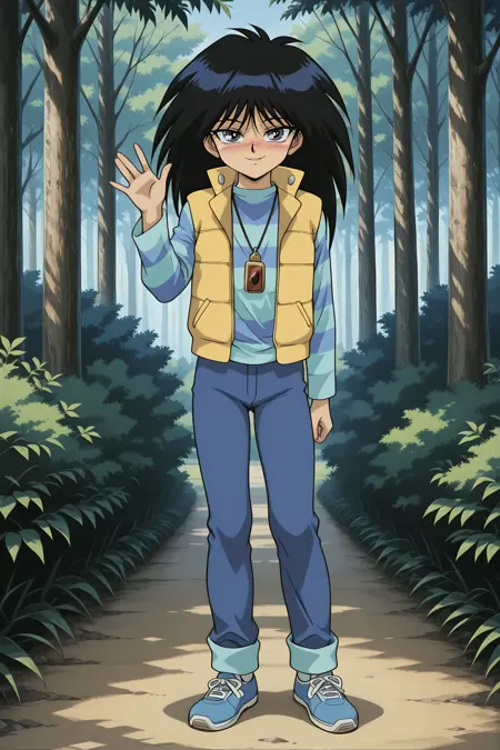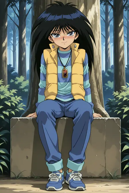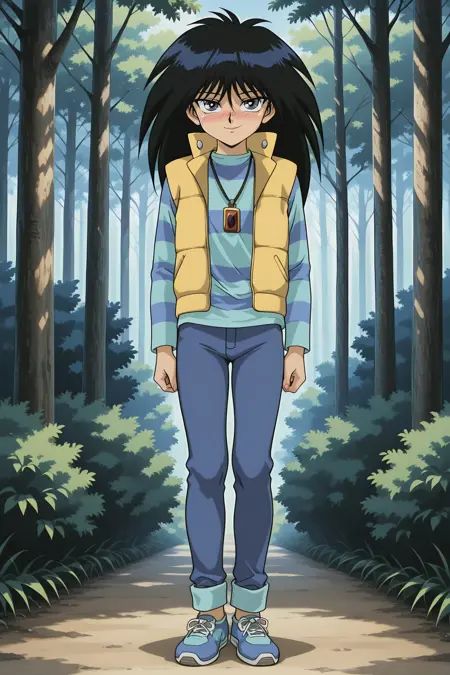 ➜ MokubaKaibaYGOILXL, 레트로 아트스타일, 보라색 눈, 검은 머리, 긴 머리, 눈 사이의 머리카락, 평평한 가슴, 목걸이, 노란 조끼, 파란 셔츠, 줄무늬 셔츠, 파란 바지, 파란 신발