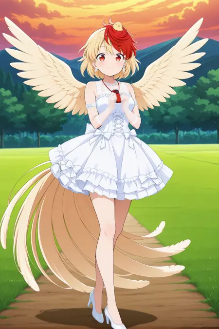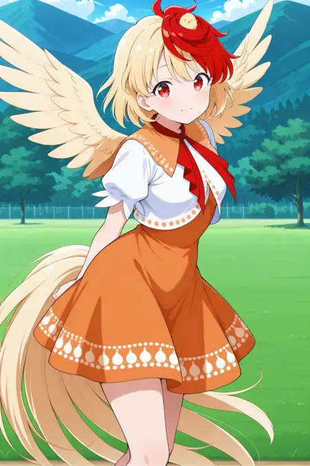 niwatari kutaka, 1girl, solo, red eyes, two-tone hair, blonde hair, red hair, short hair, bird tail, bird wings, yellow wings,
