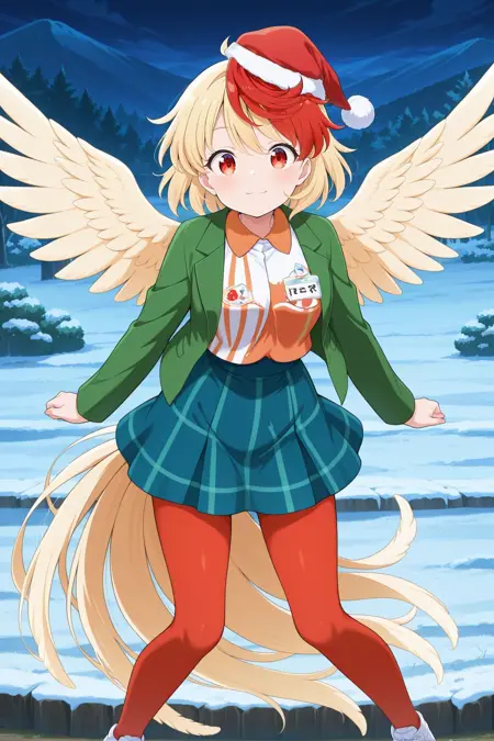 niwatari kutaka, 1girl, solo, red eyes, two-tone hair, blonde hair, red hair, short hair, bird tail, bird wings, yellow wings, niwatari kutaka \(come get your christmas chicken\), alternate costume, red hat, santa hat, green jacket, long sleeves, open jacket, two-tone shirt, white shirt, orange shirt, vertical-striped shirt, two-tone skirt, blue skirt, checkered skirt, green skirt, red pantyhose, white shoes, sneakers, name tag,